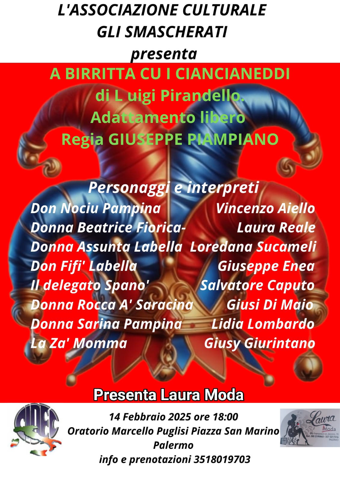 “A birritta cu i ciancianeddi” è il titolo della commedia in due atti, liberamente adattata dal regista Giuseppe Piampiano, ispirata a “Il berretto a sonagli” di Luigi Pirandello.