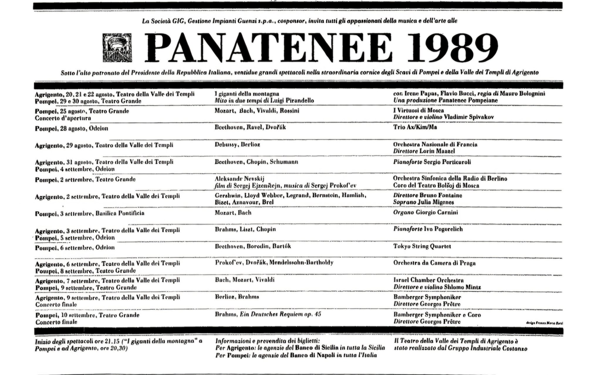 Nel cuore dell’estate del 1989 Agrigento respirava aria di cultura vera, internazionale, raffinata. Era il tempo delle Panatenee, una rassegna musicale e teatrale di straordinario respiro che univa, in un gemellaggio epico, la Valle dei Templi agli Scavi di Pompei, sotto l’alto patrocinio del Presidente della Repubblica Italiana.