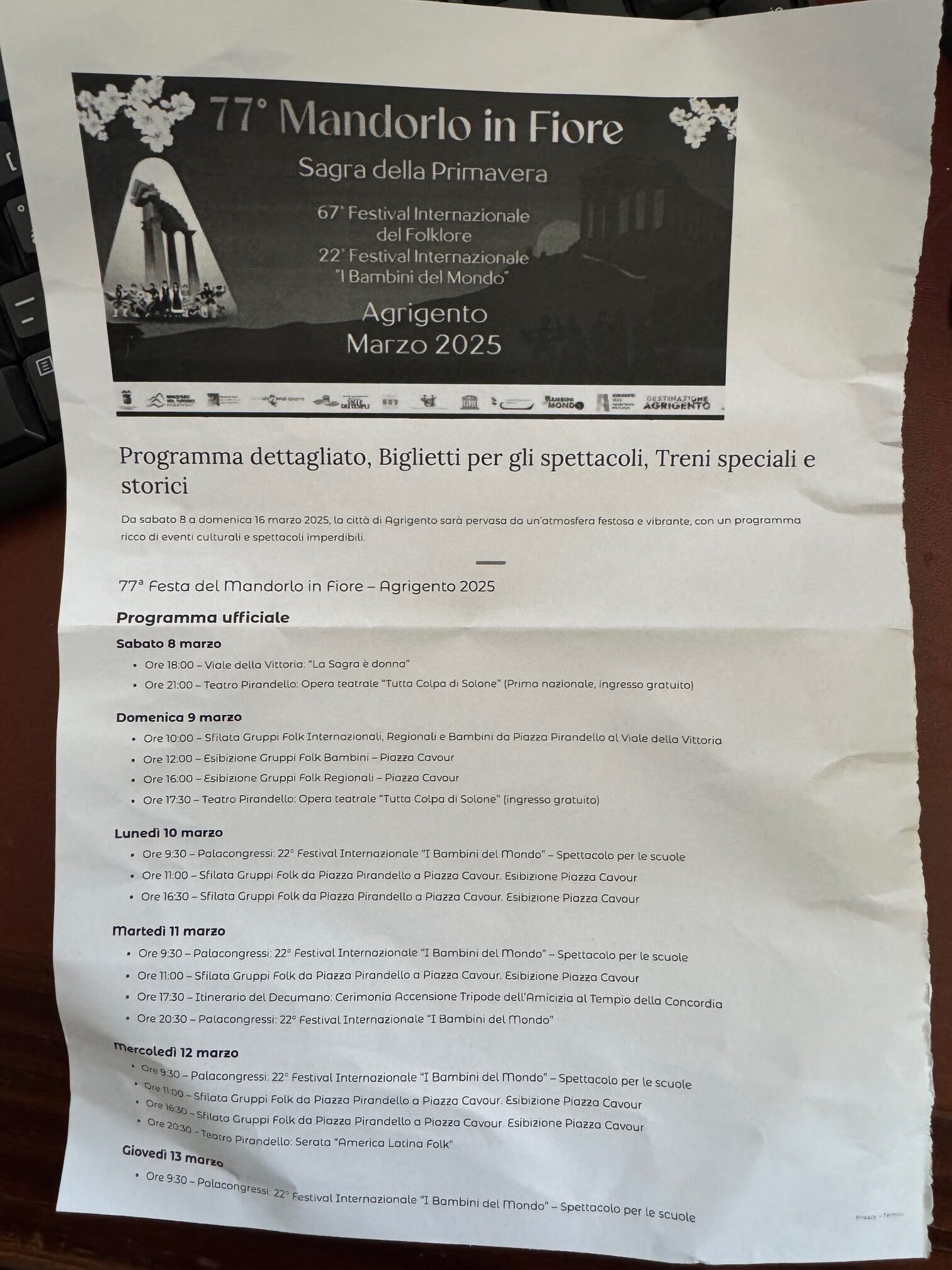 A cinque giorni dall’inizio della 77ª Festa del Mandorlo in Fiore, un evento incluso nel programma ufficiale di Agrigento Capitale Italiana della Cultura 2025, la disorganizzazione regna sovrana. Non esiste un info point funzionante, nessuna brochure ufficiale è stata distribuita e la Fondazione Agrigento 2025 – già finanziata – non è ancora operativa.