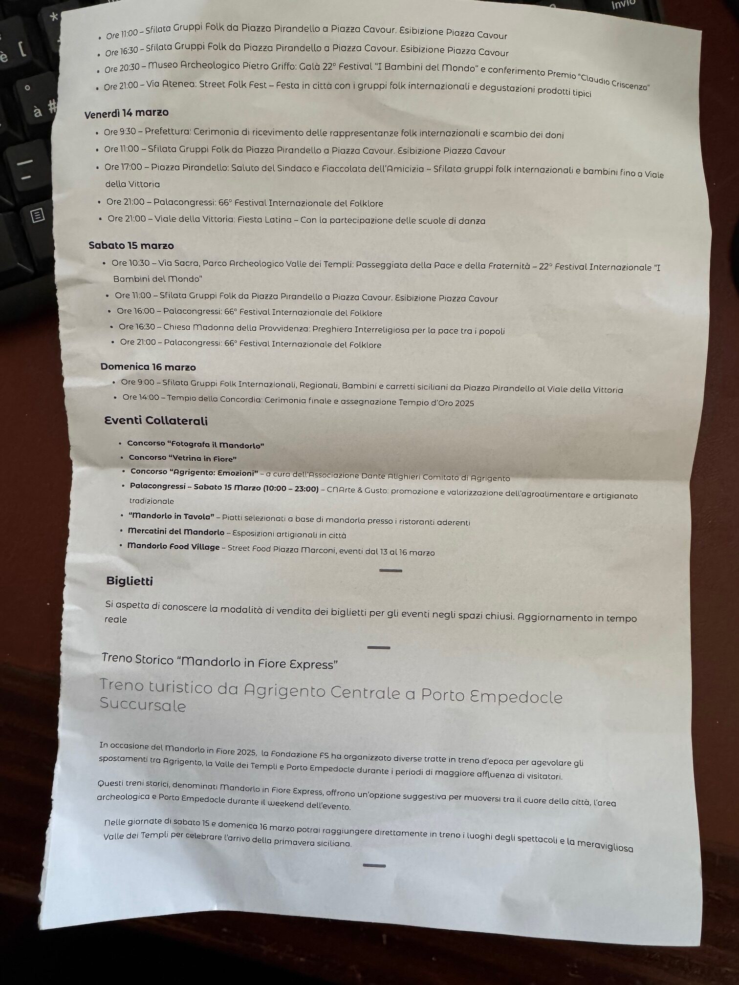 A cinque giorni dall’inizio della 77ª Festa del Mandorlo in Fiore, un evento incluso nel programma ufficiale di Agrigento Capitale Italiana della Cultura 2025, la disorganizzazione regna sovrana. Non esiste un info point funzionante, nessuna brochure ufficiale è stata distribuita e la Fondazione Agrigento 2025 – già finanziata – non è ancora operativa.