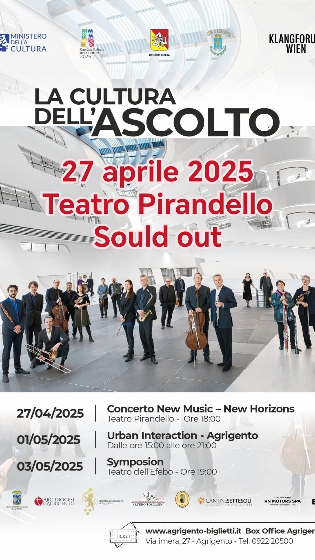 Alla biglietteria ufficiale di Agrigento è stata esposta una locandina che recita a caratteri cubitali: “Teatro Pirandello – Sold Out” per il concerto “La cultura dell’ascolto” tenutosi oggi, 27 aprile 2025.