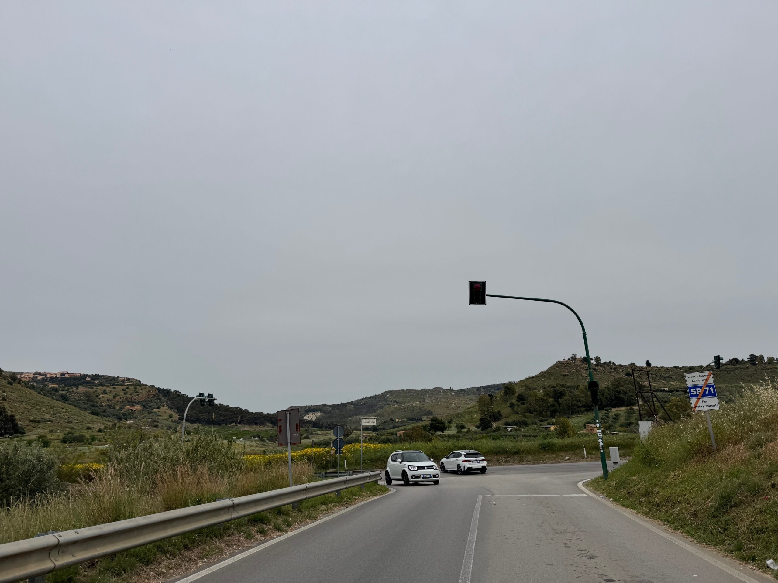 SP71 direzione Villaseta – Villaggio Mosè, tratto di raccordo privo di segnalazione luminosa, in un’area completamente buia.