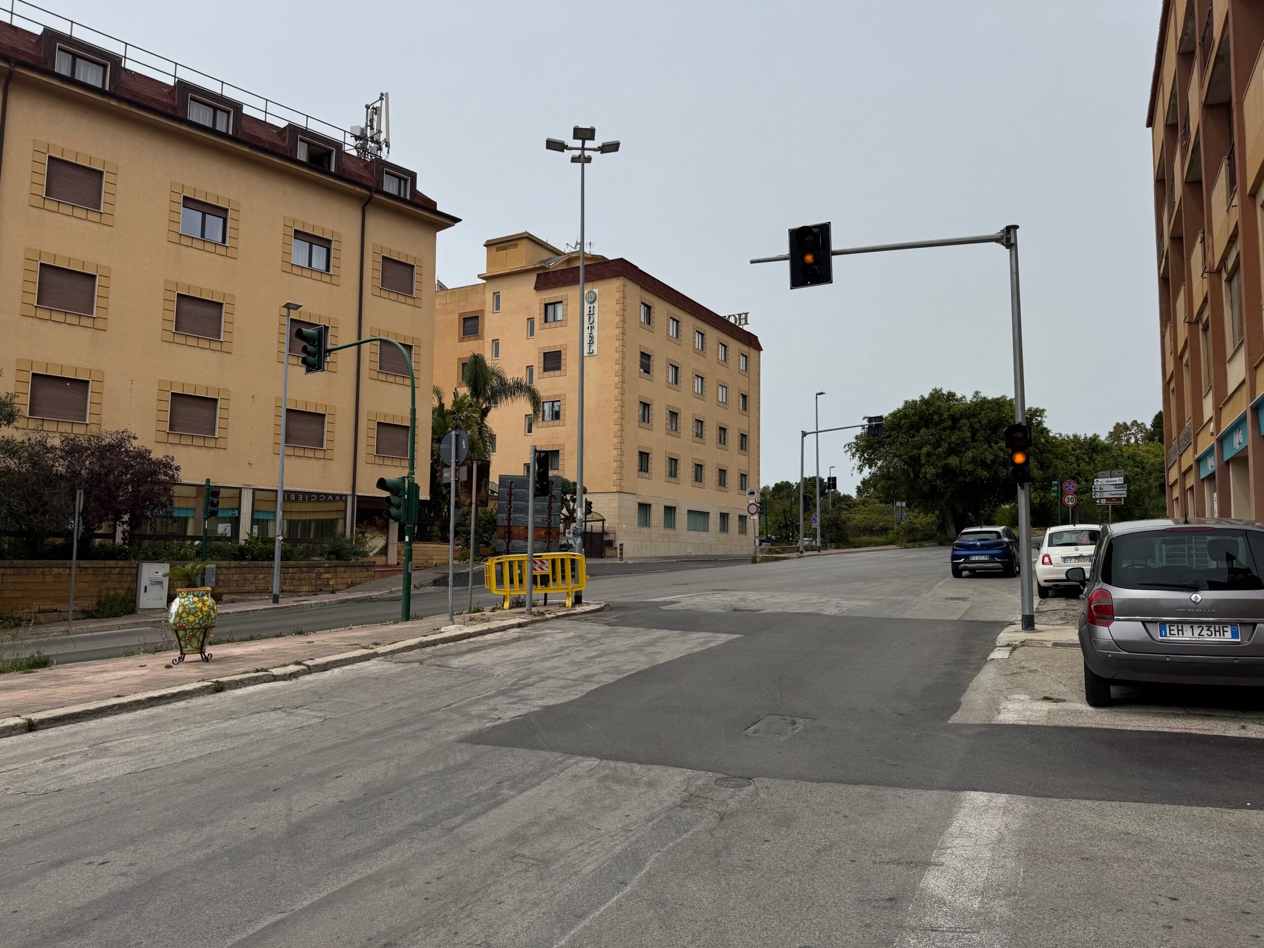 Incrocio del Viale della Vittoria, arteria centrale con impianti spenti e segnaletica poco visibile.