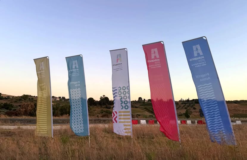 Le immagini sono inequivocabili: alte bandiere colorate con il logo di Agrigento Capitale Italiana della Cultura 2025, installate all’interno dello spartitraffico, a ridosso di una delle rotatorie più trafficate della città, lungo l’asse viario statale che conduce alla Valle dei Templi.