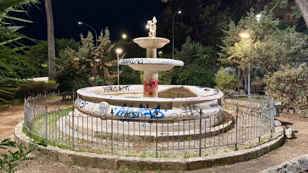 Eppure, già nel 2019, la fontana era ridotta a una latrina a cielo aperto, invasa da rifiuti e scritte vandaliche. Oggi, nel 2025, la situazione è persino peggiore: non solo non zampilla più, ma porta i segni evidenti dell’incuria e della disattenzione istituzionale.