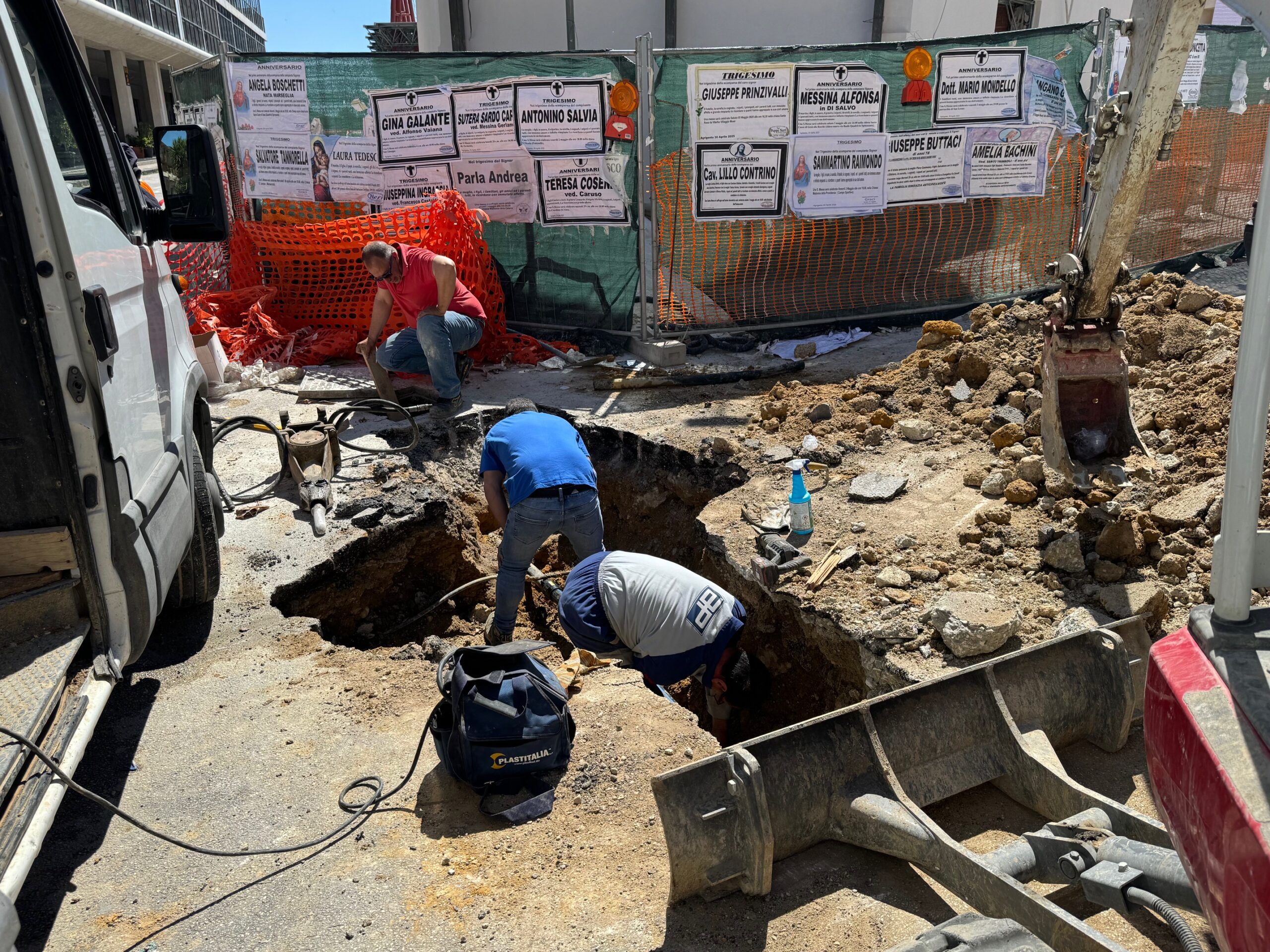 L’intervento si è reso necessario in seguito al cedimento del manto stradale avvenuto dopo una precedente riparazione. Le immagini documentano chiaramente la gravità della situazione: un escavatore in azione, operai nel sottosuolo e il traffico deviato per consentire la messa in sicurezza dell’area.