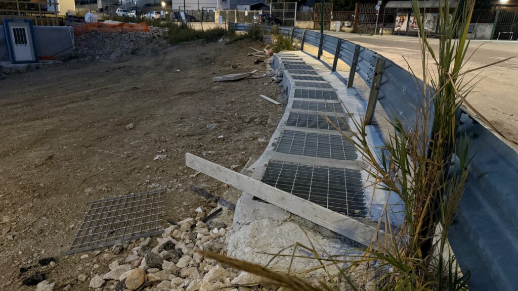 Nelle ultime ore, la ditta esecutrice ha coperto il vallone naturale presente da sempre in quell’area, realizzando una gabbia di raccolta delle acque meteoriche e un sistema di canalizzazione artificiale che scarica tramite un tubo di grosse dimensioni immediatamente dopo la galleria ferroviaria dismessa delle Ferrovie dello Stato.