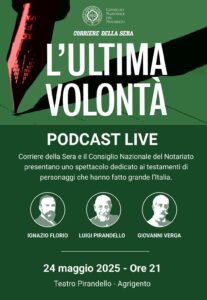 Concluderà il Convegno uno spettacolo, a ingresso libero, tratto dal podcast “L’Ultima volontà”, realizzato dal Corriere della Sera con il Consiglio nazionale del Notariato, dedicato ai testamenti dei Grandi Italiani e in particolare ai testamenti di Luigi Pirandello, Ignazio Florio e Giovanni Verga. Facile immaginare che, almeno questa volta, il teatro venga riempito in ogni ordine di posti, a differenza dei flop recenti della gestione Fondazione Capitale della Cultura.