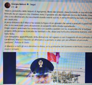 Essere elogiati attraverso un post social non è da tutti. Esserlo per avere fatto bene il proprio lavoro è raro. Ricevere pubbliche congratulazioni dal Presidente del Consiglio dei Ministri è raro come la neve a ferragosto. C’è però un agrigentino che un paio d’ore fa la “neve a ferragosto” l’ha ricevuta davvero, direttamente sul proprio telefono cellulare. Si tratta di un poliziotto, Marco Ciulla, figlio di Lillo, anch’esso agente in pensione della Questura di Agrigento da poco in pensione. Marco nei giorni scorsi ha salvato la vita a un aspirante suicida, ottenendo pubblici riconoscimenti. Quello della presidente del Consiglio Giorgia Meloni, direttamente dal proprio account di Facebook, certamente non se lo aspettava. Ecco il testo: “Marco, poliziotto delle Volanti di Agrigento, libero dal servizio, stava tornando a casa ed è stato fermato da un ragazzo che chiedeva aiuto. Il giovane era alla disperata ricerca del fratello 22enne, che si era allontanato da casa manifestando intenti suicidi, e aveva trovato la sua auto nei pressi di un cavalcavia. A poca distanza da lì Marco ha notato la figura di un giovane che aveva scavalcato il guard rail e che si era avvicinato pericolosamente al parapetto della strada sopraelevata. Dopo essersi avvicinato ha cominciato con cautela a parlare con lui, scoprendo che si trattava proprio della persona ricercata dai familiari e che, dopo una fortissima delusione d’amore, voleva farla finita. Con tempismo, approfittando della distrazione del ragazzo e con il supporto di una pattuglia dei carabinieri, Marco è riuscito ad afferrarlo e a portarlo in salvo per poi affidarlo al personale sanitario”.