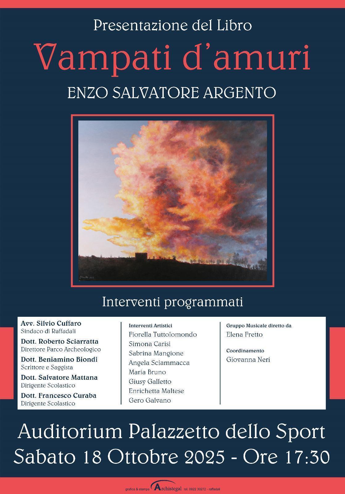 RAFFADALI – Si è svolta sabato 18 ottobre, presso l’Auditorium del Palazzetto dello Sport di Raffadali, la presentazione del libro “Vampati d’amuri” di Enzo Salvatore Argento, un evento che ha registrato una straordinaria partecipazione di pubblico e un clima di intensa emozione culturale.