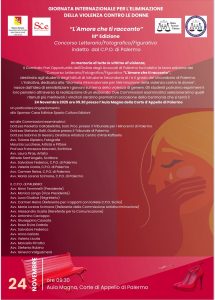 La galleria palermitana, che vede alla direzione artistica Sabrina Di Gesaro, farà parte della Commissione esaminatrice del concorso “L’amore che ti racconto”, promosso dal Comitato Pari Opportunità dell’Ordine degli Avvocati di Palermo e dedicato alla Giornata Internazionale per l’eliminazione della violenza contro le donne che si celebra il 25 novembre di ogni anno.