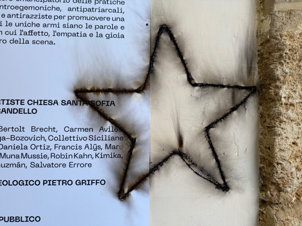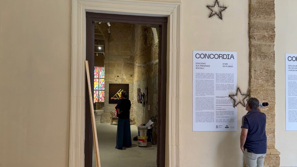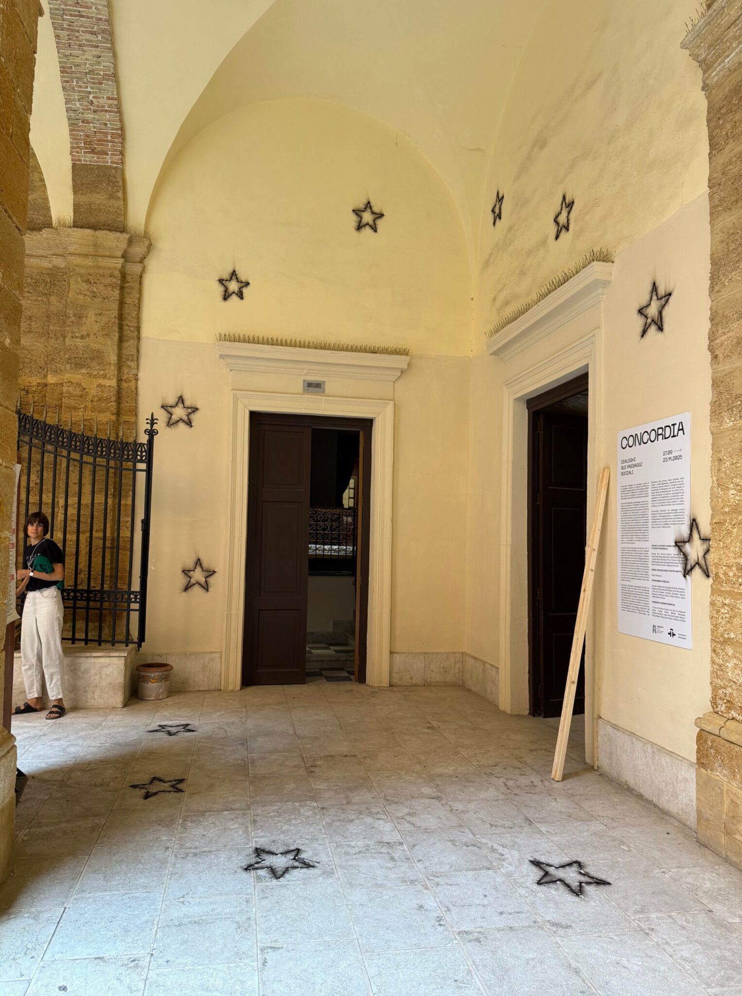 Agrigento torna al centro delle polemiche per l’ennesimo scempio ai danni di un bene vincolato. Dopo la vicenda del novembre 2024, quando denunciammo l’uso di chiodi sulle pareti del Palazzo San Domenico, oggi l’atrio del palazzo comunale — edificio monumentale tutelato — si presenta imbrattato da installazioni artistiche che hanno inciso in maniera definitiva le mura e il pavimento.