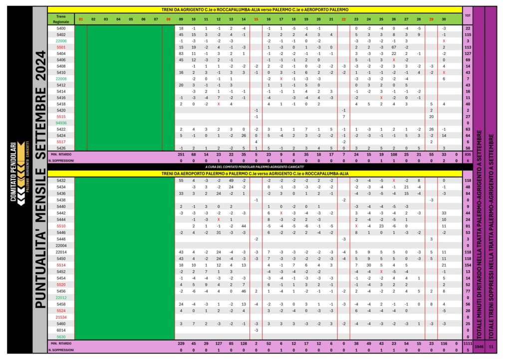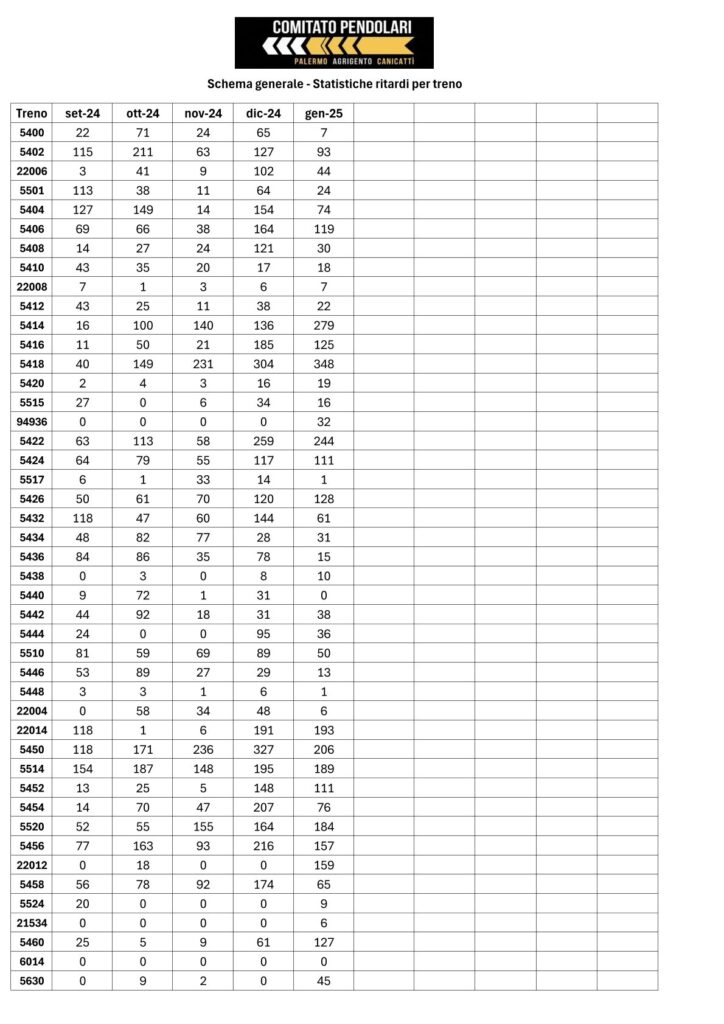 I dati raccolti dal Comitato sono disponibili attraverso grafici e tabelle estratte da un file Excel con sei fogli: cinque mensili (da settembre 2024 a gennaio 2025) e uno riepilogativo. Ogni foglio documenta il numero del treno, i ritardi e le soppressioni giornaliere, offrendo una chiara testimonianza dell’inefficienza del servizio.