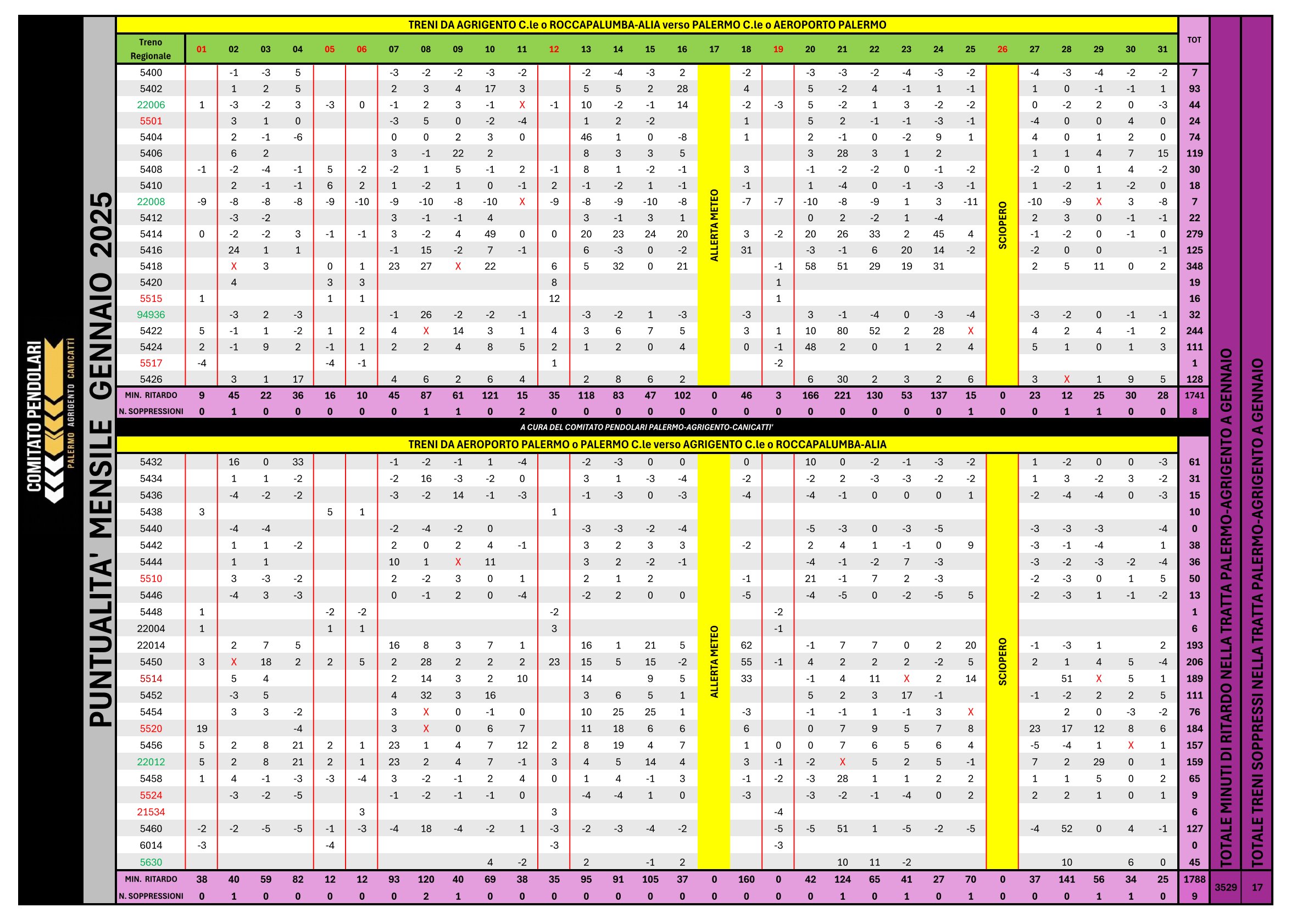 I dati raccolti dal Comitato sono disponibili attraverso grafici e tabelle estratte da un file Excel con sei fogli: cinque mensili (da settembre 2024 a gennaio 2025) e uno riepilogativo. Ogni foglio documenta il numero del treno, i ritardi e le soppressioni giornaliere, offrendo una chiara testimonianza dell’inefficienza del servizio.