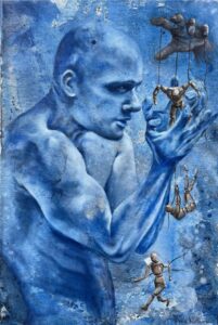 “Manipolazione”, realizzata in acrilico e olio su tela, lascia intravedere riflessioni legate alla condizione femminile contemporanea, alla violenza delle guerre e delle ideologie totalitarie, agli interessi economici, alle prevaricazioni religiose.