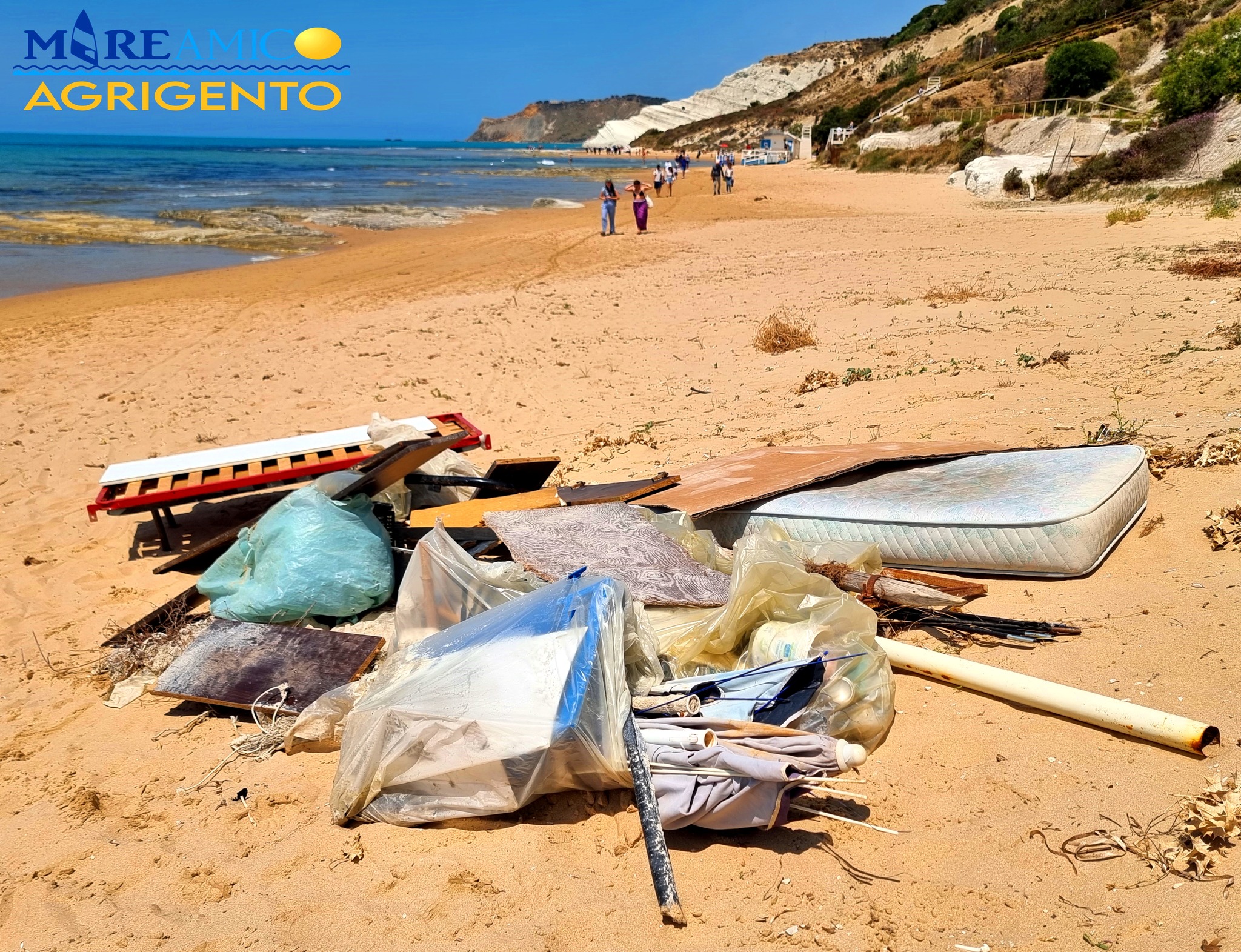 In attesa che sulla Scala dei Turchi cessi il teatrino delle competenze, delle responsabilità e dell’uso che se ne dovrà fare, c’è da salvaguardarne l’integrità ecologica. Negli scorsi giorni il Commissario straordinario del comune di Realmonte aveva deciso, con propria ordinanza, di permettere gli ingressi contingentati dei visitatori, a pagamento e con prenotazioni on line. A questo punto l’associazione Mareamico, che da sempre ha fornito la propria collaborazione per questo progetto, ha organizzato un’operazione di pulizia della spiaggia, per renderla più gradevole ai visitatori. Racconta Claudio Lombardo, presidente dell’associazione: “Abbiamo trovato, prelevato ed eliminato diversi quintali di rifiuti, che subito il Comune porterà in discarica. Oltre ai soliti rifiuti, abbiamo trovato in spiaggia, un materasso, due lettini e diversi ombrelloni, utilizzati dai venditori ambulanti, presenti in grande numero su questa importante spiaggia”. Un mini deposito di masserizie abbandonate è stato tolto di mezzo, con la speranza che nei prossimi mesi non se ne raccolgano altri. Tutelare la Scala dei Turchi è anche impedire che gli incivili la trasformino in terra di nessuno, dove abbandonare ogni tipo di rifiuto.