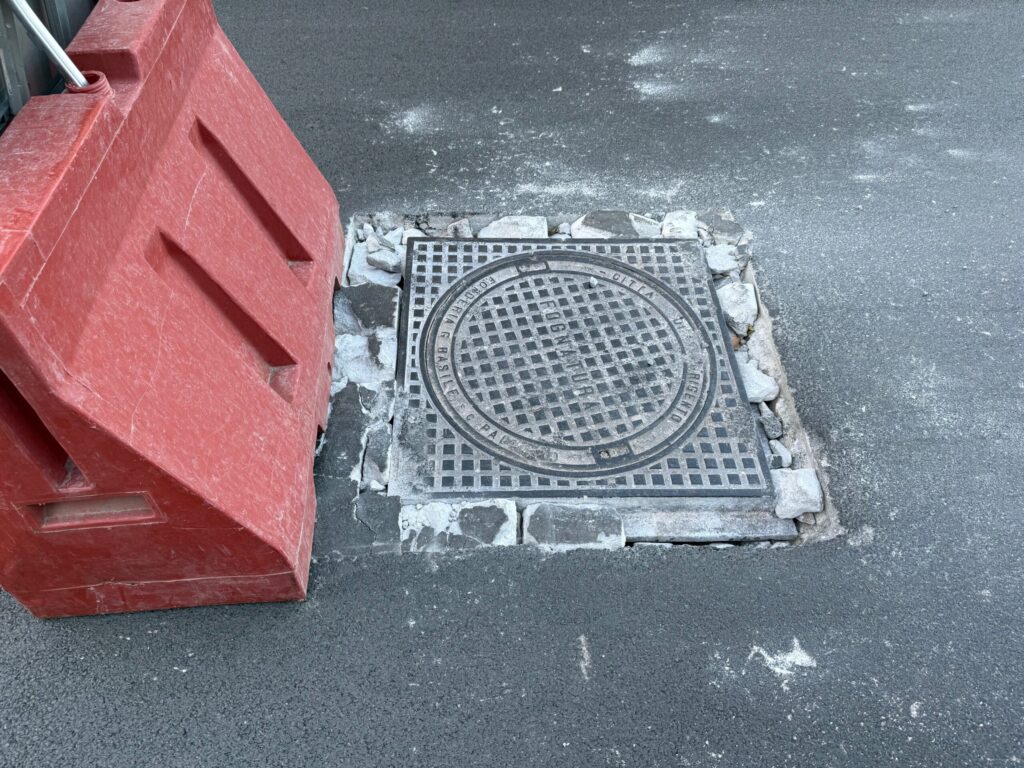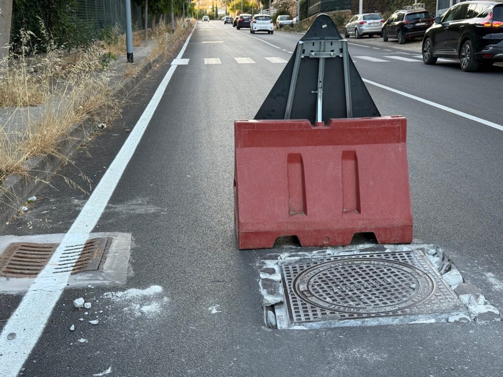 In alcuni casi, come in via Empedocle, la situazione è talmente paradossale che il passaggio pedonale è bloccato da una transenna a protezione di un tombino… all’interno delle strisce zebrate. Come si vede nella foto a corredo, alla fine il “tombino” non è stato affatto sostituito: la buca è stata semplicemente chiusa, cancellando l’alloggiamento stesso e lasciando un rattoppo di asfalto al suo posto.