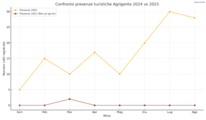 Ecco l’infografica integrata richiesta. Il grafico mostra chiaramente la netta differenza tra le presenze turistiche nei primi mesi del 2024 e del 2025 ad Agrigento, smentendo qualsiasi ipotesi di crescita reale a fronte del crollo documentato fino ad aprile 2025.