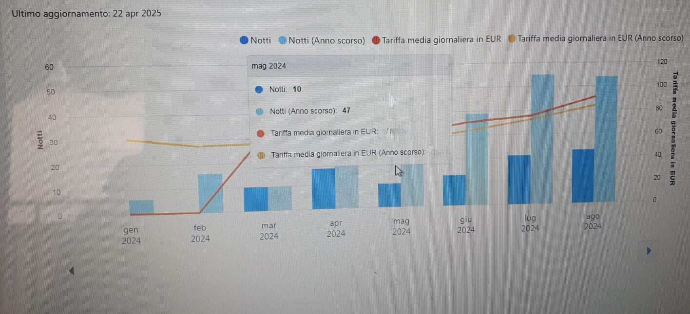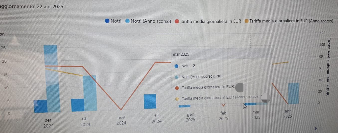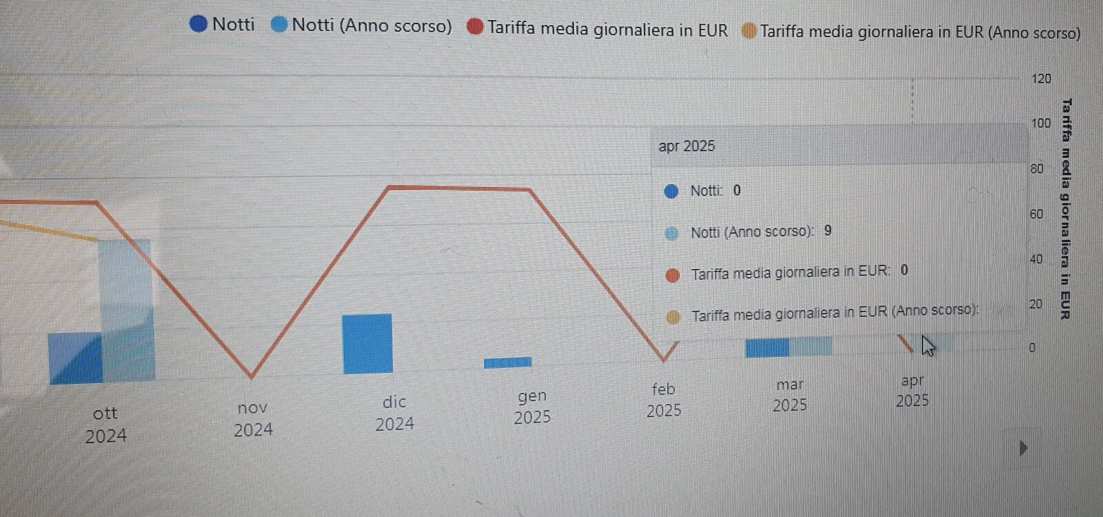 Basta osservare i grafici allegati per comprendere la distorsione: a marzo 2025 si registrano solo 2 notti, contro le 10 dello stesso mese nel 2024. Un crollo dell’80%. Ad aprile 2025, il dato risale a 0 notti contro le 17 di aprile 2024. Quindi non c’è alcuna crescita reale: al contrario, c’è un tracollo, che viene mascherato paragonandolo al già disastroso marzo 2025.