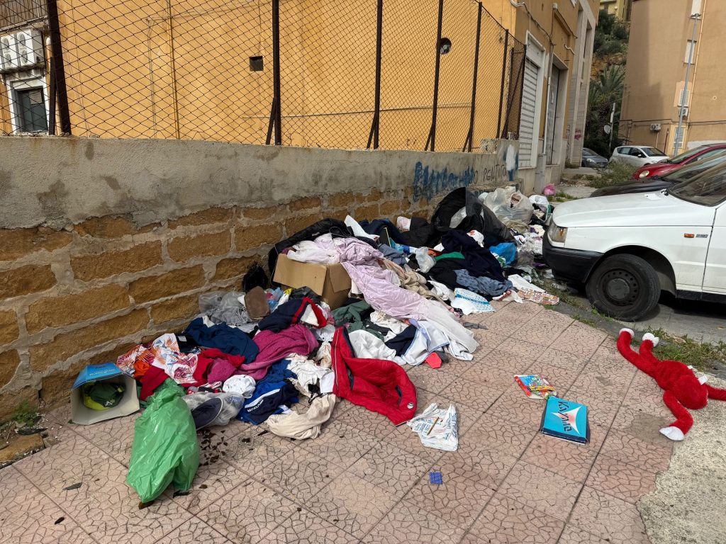 Siamo in via Michele Caruso Lanza, nel cuore del quartiere “Campo Sportivo”, nello stesso punto dove fino a pochi mesi fa erano installati i contenitori per la raccolta di abiti e accessori usati, un servizio soppresso senza alcuna alternativa. Oggi, al loro posto, c’è solo una montagna di rifiuti, sacchi di vestiti sparsi ovunque, scatole, bottiglie e cartoni abbandonati sul marciapiede.
