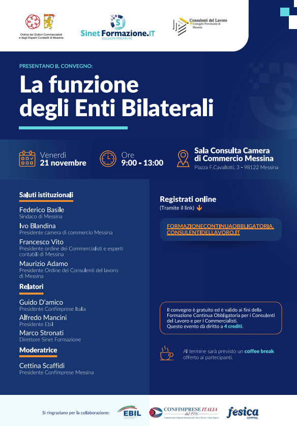 L’evento, promosso da Confimprese Italia, EBIL e SINET Formazione, è accreditato da parte dell’Ordine dei Dottori Commercialisti ed Esperti Contabili di Messina e dall’Ordine Provinciale dei Consulenti del Lavoro di Messina.