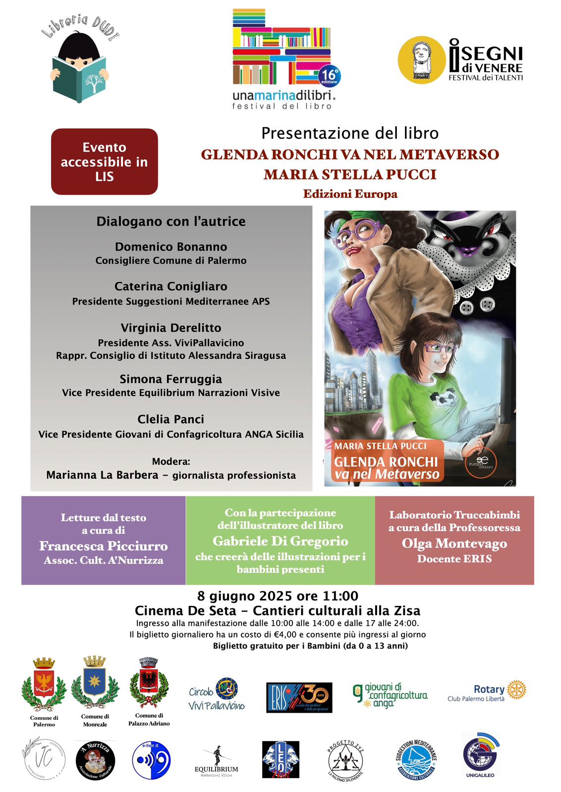 L’appuntamento culturale si arricchirà delle letture dell’attrice Francesca Picciurro dell’associazione culturale “’A Nurrizza” e della partecipazione di Gabriele Di Gregorio, illustratore di “Glenda Ronchi va nel Metaverso” che, nell’occasione, creerà delle illustrazioni per i bambini presenti.