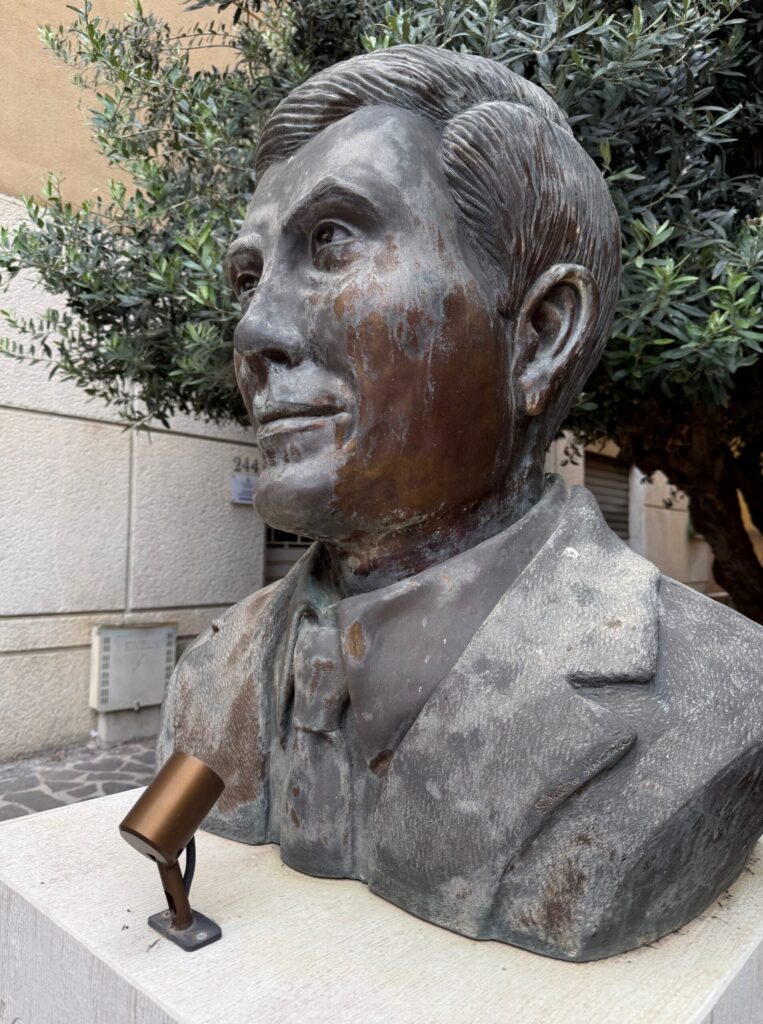 Le immagini parlano da sole: l’opera, collocata in un angolo del centro cittadino, appare segnata dal tempo e dall’incuria. La superficie in bronzo è corrosa, macchiata e scolorita, tanto da renderla quasi inguardabile. Non solo: il volto raffigurato non ha mai realmente somigliato al Beato, al punto che molti turisti e visitatori non riescono neppure a riconoscerlo.