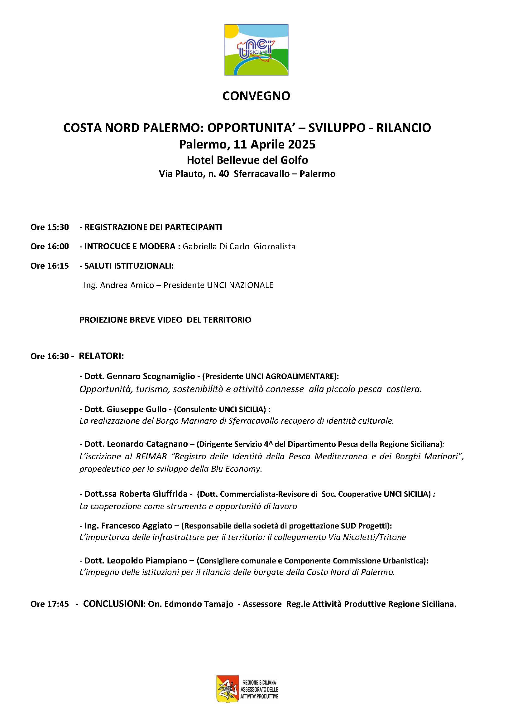 I lavori, introdotti e moderati dalla giornalista Gabriella Di Carlo, si apriranno con i saluti istituzionali del presidente nazionale dell’UNCI Andrea Amico e proseguiranno con i contributi dei relatori: il presidente di UNCI Agroalimentare Gennaro Scognamiglio, il consulente di UNCI Sicilia Giuseppe Gullo, il dirigente del Servizio 4 del Dipartimento Pesca della Regione Siciliana Leonardo Catagnano, il revisore Roberta Giuffrida, il responsabile della società di progettazione SUD Progetti Francesco Aggiato e il consigliere del Comune di Palermo Leopoldo Piampiano, componente della Commissione Urbanistica.