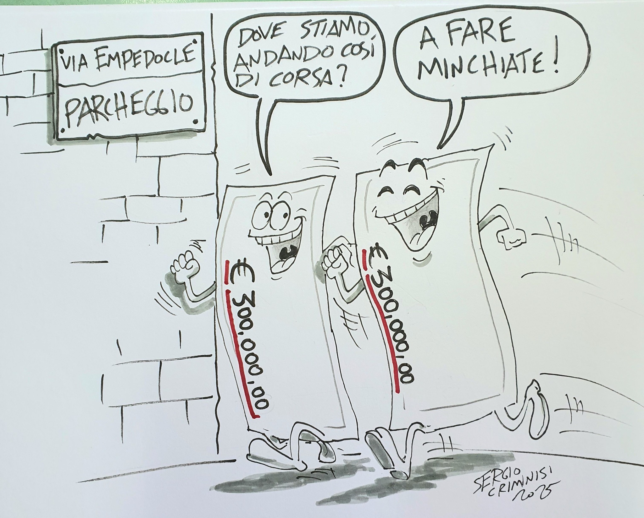 La notizia non è passata inosservata nemmeno nel mondo dell’arte. Il vignettista Sergio Criminisi ha pubblicato una vignetta satirica che mette in luce l’assurdità della situazione: 600.000 euro per ripristinare un parcheggio che non necessita di interventi, con un progetto di cui non si conoscono nemmeno i dettagli. Un’ironia che riflette il sentimento di molti cittadini agrigentini.