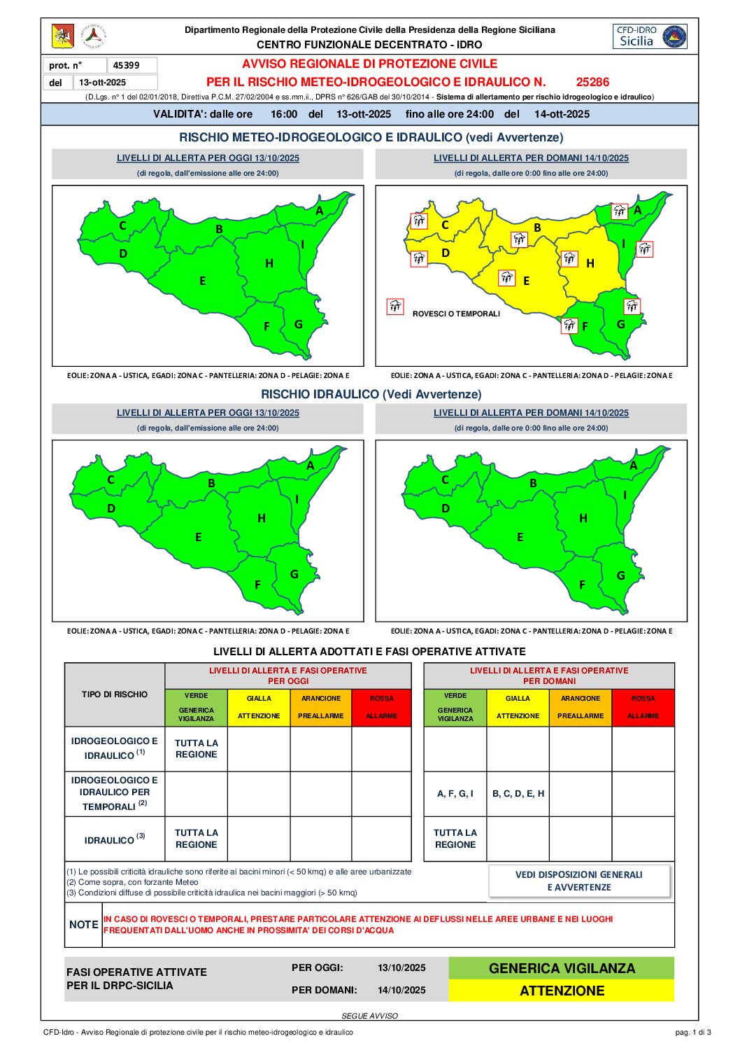 Il Dipartimento Regionale della Protezione Civile (D.R.P.C.) ha diramato l’avviso n. 25286 per rischio meteo-idrogeologico e idraulico, con livello di allerta “gialla” (attenzione), valido dalle ore 00:00 alle ore 24:00 del 14 ottobre 2025 su tutto il territorio siciliano.