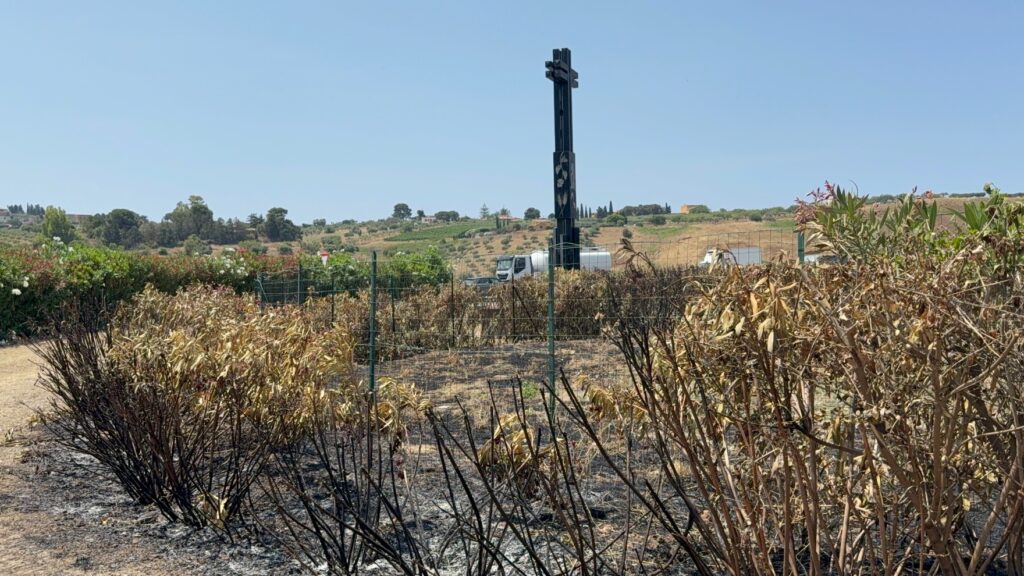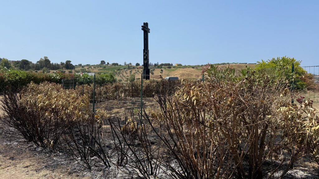 AGRIGENTO – Le fiamme non hanno avuto pietà. Dopo mesi di appelli inascoltati e denunce pubblicate, la Croce dedicata a Giovanni Paolo II – monumento simbolo della storica visita del 9 maggio 1993 – è oggi circondata da un paesaggio carbonizzato. Il giardino della memoria che circondava l’opera è stato letteralmente distrutto dal fuoco.
