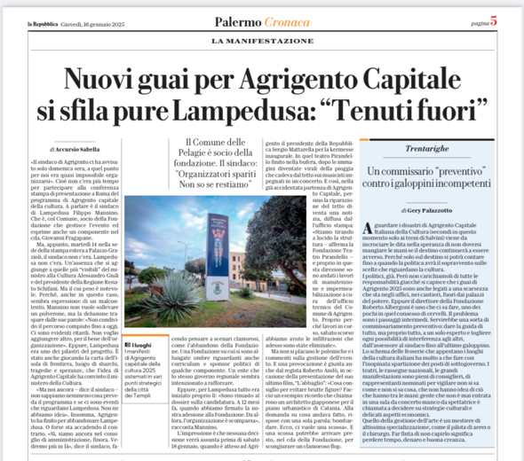 La gestione di Agrigento Capitale Italiana della Cultura 2025 continua a suscitare polemiche e malcontenti. L’ultimo colpo arriva da Lampedusa, che ha deciso di tirarsi fuori dal progetto, come riportato oggi dal quotidiano La Repubblica. Una scelta clamorosa che mette ulteriormente in discussione l’organizzazione e la trasparenza di un’iniziativa nata per celebrare il patrimonio culturale siciliano ma che si sta rivelando un terreno di scontri politici e amministrativi.