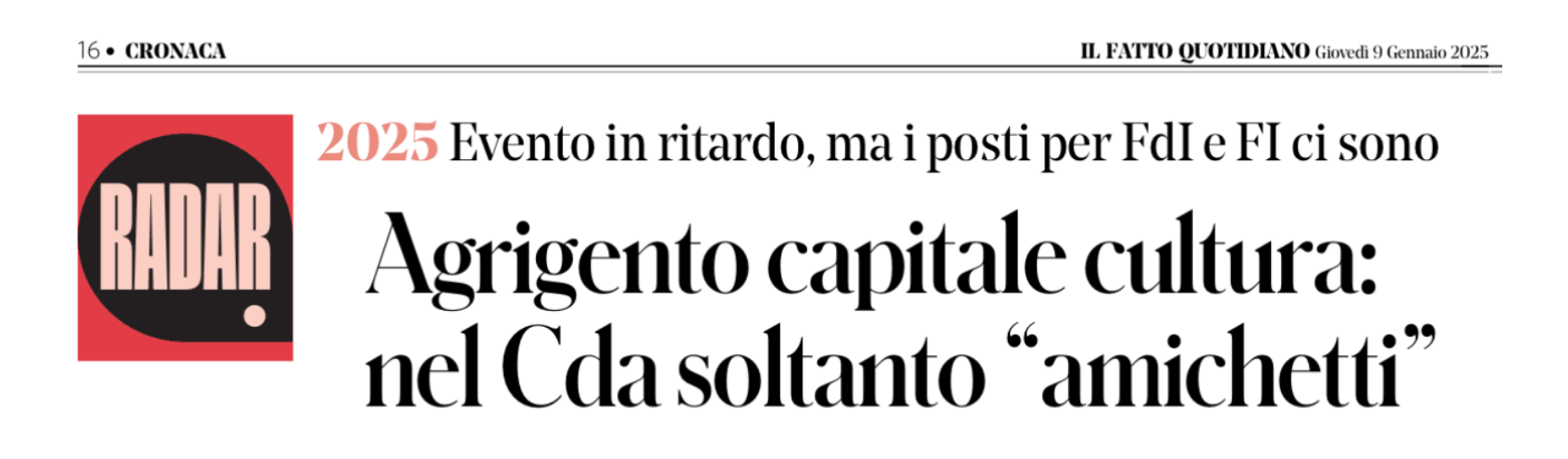 Agrigento, 9 gennaio 2025 – Il quotidiano nazionale Il Fatto Quotidiano torna a puntare i riflettori su Agrigento, approfondendo la gestione della Fondazione Capitale Italiana della Cultura 2025. L’articolo evidenzia ritardi, nomine discusse e presunti collegamenti politici, suscitando nuove polemiche su un progetto già bersaglio di critiche.