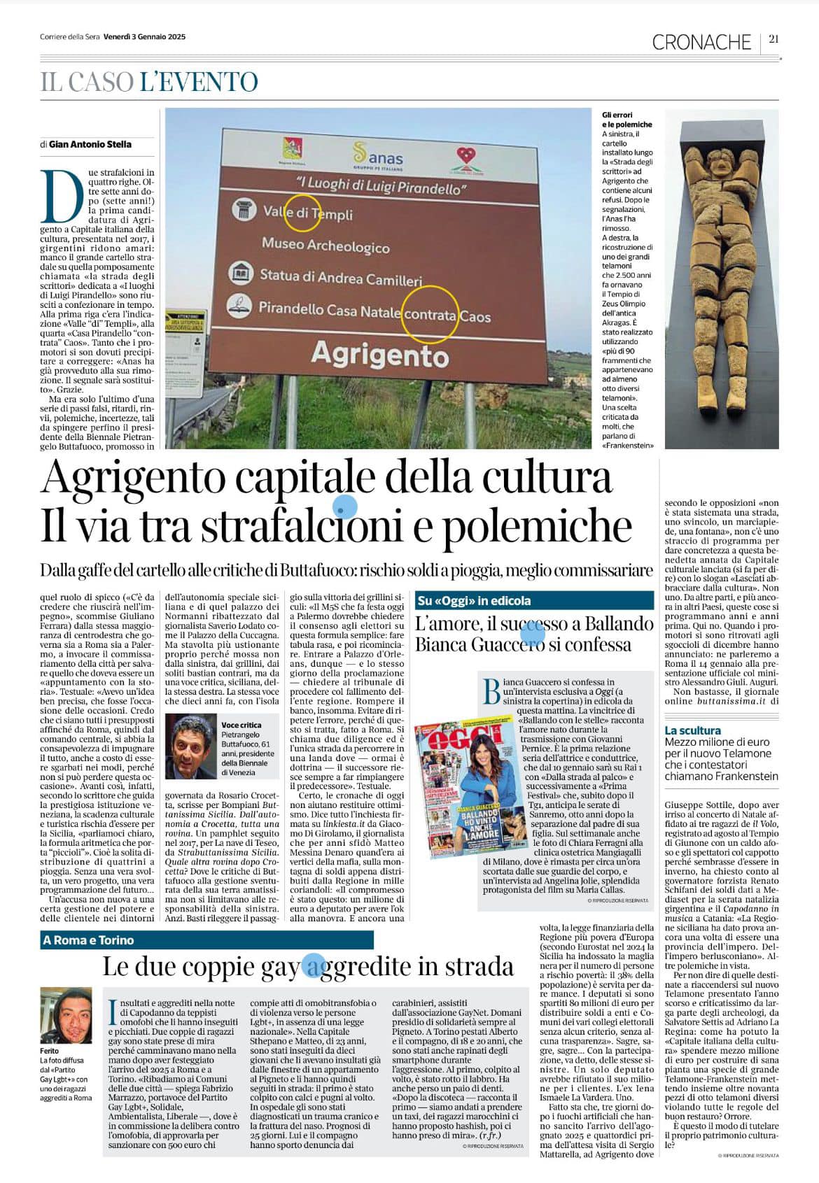 Il prestigioso titolo di Agrigento Capitale Italiana della Cultura 2025 continua a generare polemiche e critiche. Dopo le prime segnalazioni del Codacons, riprese anche da Report Sicilia, il caso è ora approdato sulla stampa nazionale, con il Corriere della Sera che dedica un approfondimento ai tanti problemi che affliggono la città. Dai cartelli segnaletici con errori clamorosi alle condizioni infrastrutturali carenti, la città rischia di diventare un esempio negativo di cattiva gestione amministrativa.