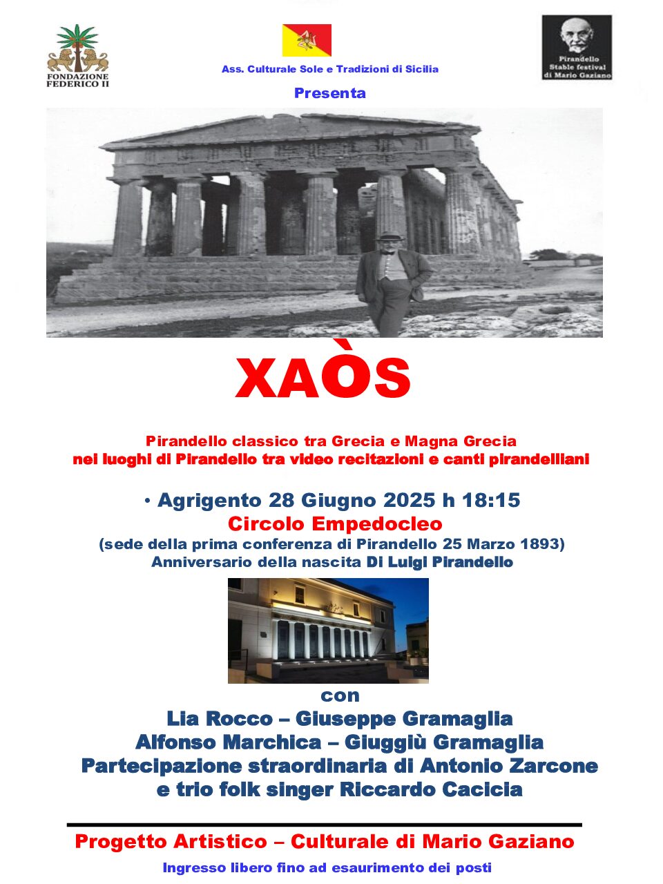 Nel cuore di Agrigento, nei luoghi dove Luigi Pirandello mosse i primi passi culturali, torna il grande teatro con un evento che unisce classico, mito e appartenenza siciliana: sabato 28 giugno 2025 alle ore 18:15, il Circolo Empedocleo ospita lo spettacolo “XAòS – Pirandello classico tra Grecia e Magna Grecia”, in occasione del 158° anniversario della nascita del drammaturgo agrigentino.