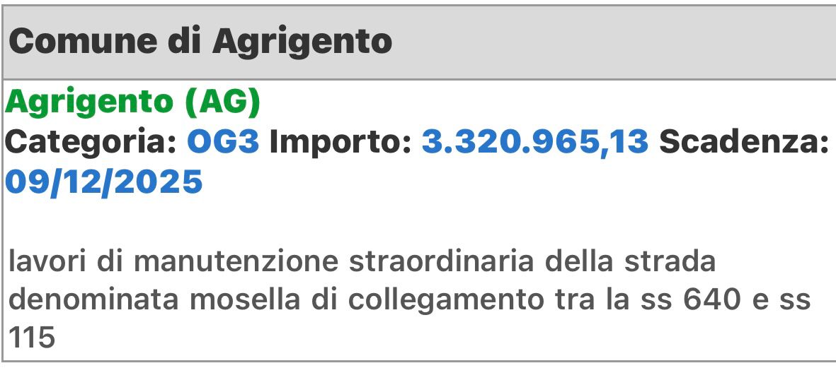 il Comune di Agrigento ha bandito i lavori di manutenzione straordinaria della strada Mosellà, per un importo complessivo di € 3.320.965,13 – categoria OG3 – con scadenza il 9 dicembre 2025.
