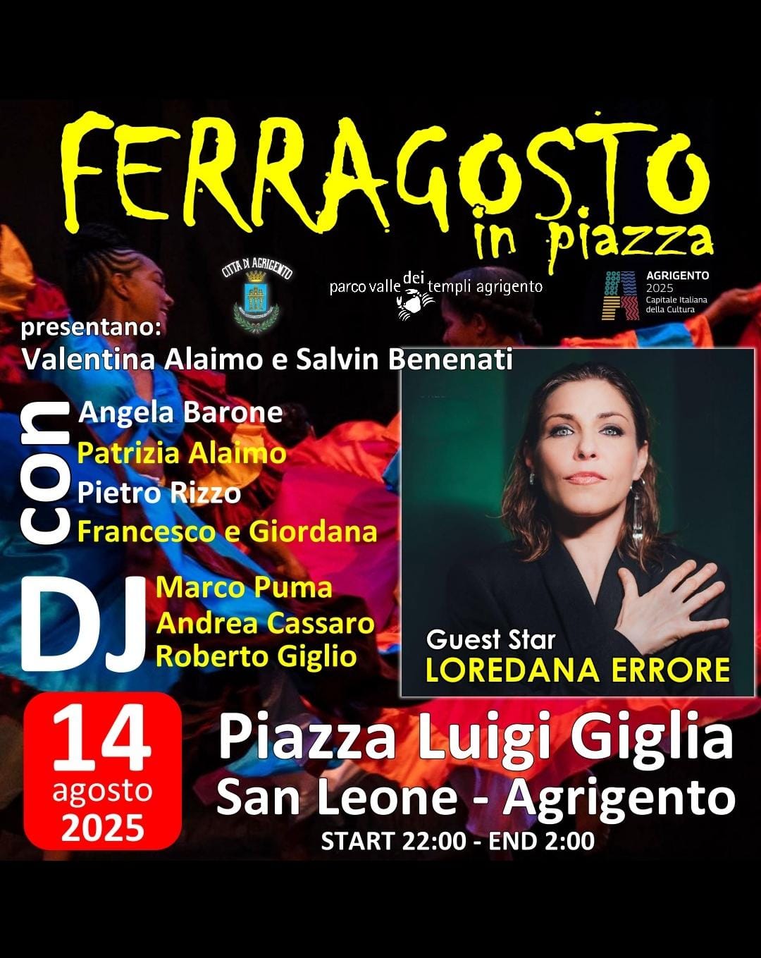 Giovedì 14 agosto, dalle ore 22, piazzale Giglia ospiterà una serata all’insegna di musica, danza e intrattenimento: selezioni musicali anni ’70, ’80 e ’90 curate da DJ locali, esibizioni in stile caraibico delle scuole di danza agrigentine e, come “dulcis in fundo”, l’esibizione della cantante Loredana Errore, stella della musica leggera italiana e orgoglio agrigentino.
