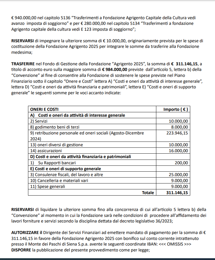 Nel dettaglio, la Fondazione “Agrigento 2025” ha stimato una spesa complessiva di € 1.177.900,00 per oneri e costi relativi al 2024. Il piano finanziario, presentato il 9 luglio 2024, ha evidenziato che una parte significativa delle spese, pari a € 223.946,15 su € 311.146,15, sarà destinata alla retribuzione del personale e agli oneri sociali per i cinque mesi da agosto a dicembre 2024. Questo importo, che rappresenta circa il 72% del totale iniziale trasferito, sottolinea l’importanza della costituzione di una solida struttura amministrativa e organizzativa per la gestione efficace delle attività della Fondazione.