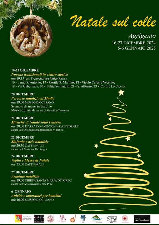Ad Agrigento si rinnova l’appuntamento con “Natale sul Colle”, un evento dedicato alle festività natalizie che animerà il centro storico della città dal 16 al 27 dicembre 2024 e nei giorni del 5 e 6 gennaio 2025. La manifestazione, organizzata nel segno della tradizione, propone un programma ricco di attività culturali, musicali e spirituali, con l’obiettivo di valorizzare il cuore storico della città e offrire ai cittadini e ai visitatori un’atmosfera autenticamente natalizia.