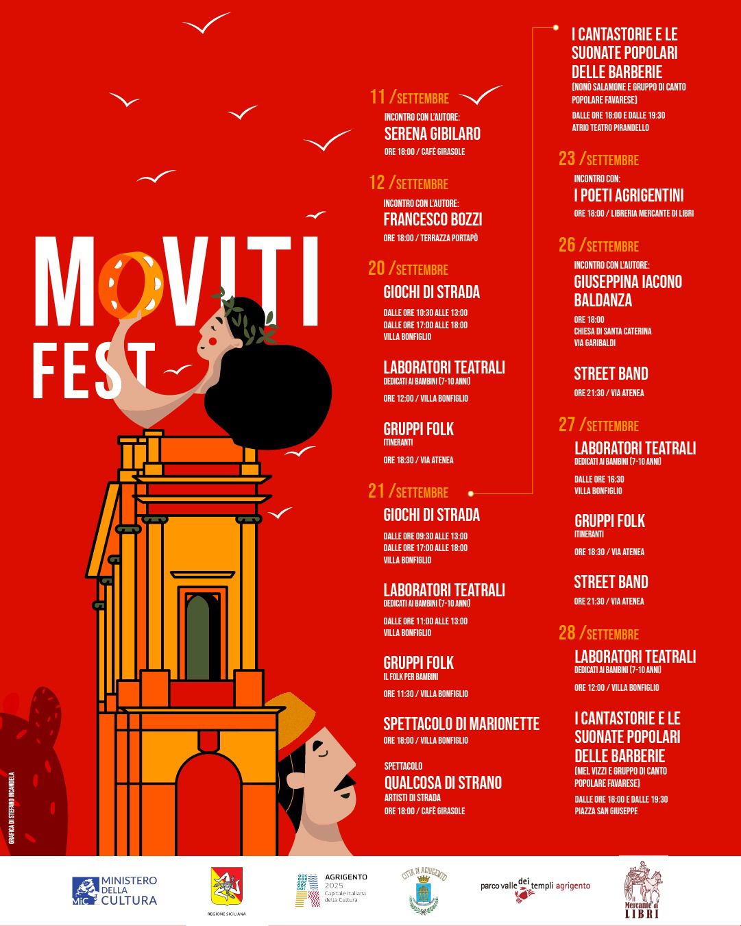 AGRIGENTO – Dopo il “Muta Muta Fest”, Agrigento lancia un nuovo appuntamento nell’ambito di Capitale Italiana della Cultura 2025: il MòViti Fest. Un progetto del Parco archeologico e paesaggistico della Valle dei Templi, sostenuto dalla Regione Siciliana, con il patrocinio del Comune di Agrigento e il supporto dell’Arcidiocesi, che da settembre a dicembre animerà il centro storico con spettacoli, laboratori, musica, libri e installazioni.