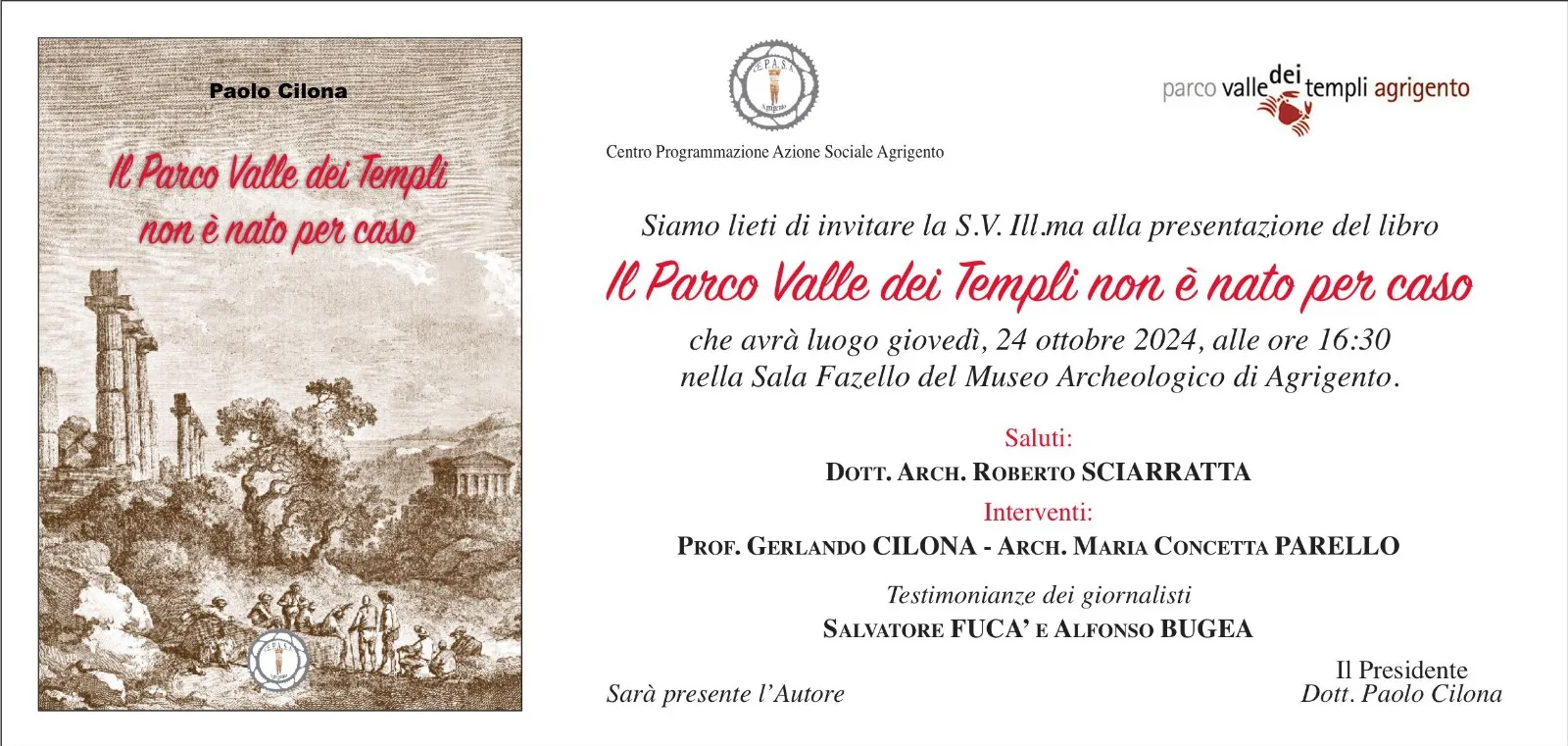 Domani, giovedì 24 ottobre, alle ore 16:30, presso la sala Fazello del Museo Archeologico “Pietro Griffo” di Agrigento, sarà presentato il libro “Il Parco Valle dei Templi non è nato per caso” scritto dal professor Paolo Cilona, direttore del Cepasa (Centro di promozione azione sociale). L’opera rappresenta un tributo alla lunga battaglia civile che ha portato all’istituzione del Parco archeologico della Valle dei Templi, un sito riconosciuto patrimonio dell’umanità dall’UNESCO.