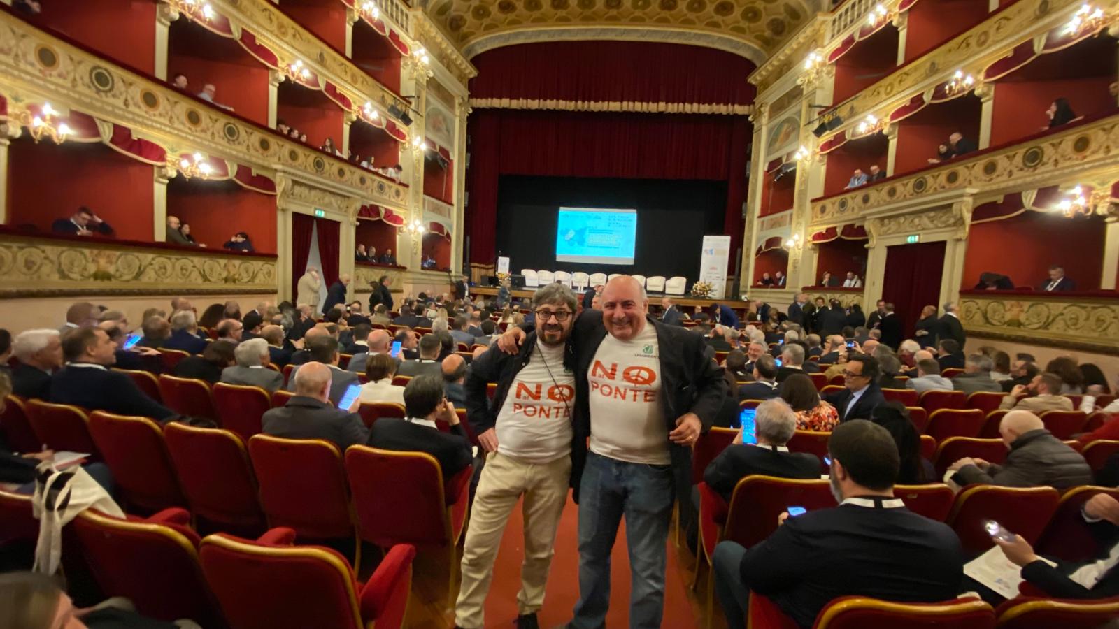 Tuttavia, l’attenzione non si è concentrata solo sugli interventi tecnici e politici, ma anche su una presenza simbolica forte tra il pubblico: gli attivisti di Legambiente Giuseppe Riccobene e Daniele Gucciardo, che si sono presentati in sala indossando maglie bianche con la scritta “NO PONTE” ben visibile.