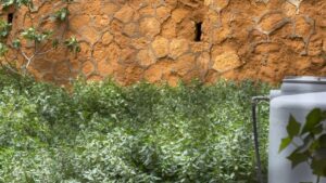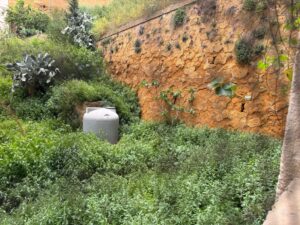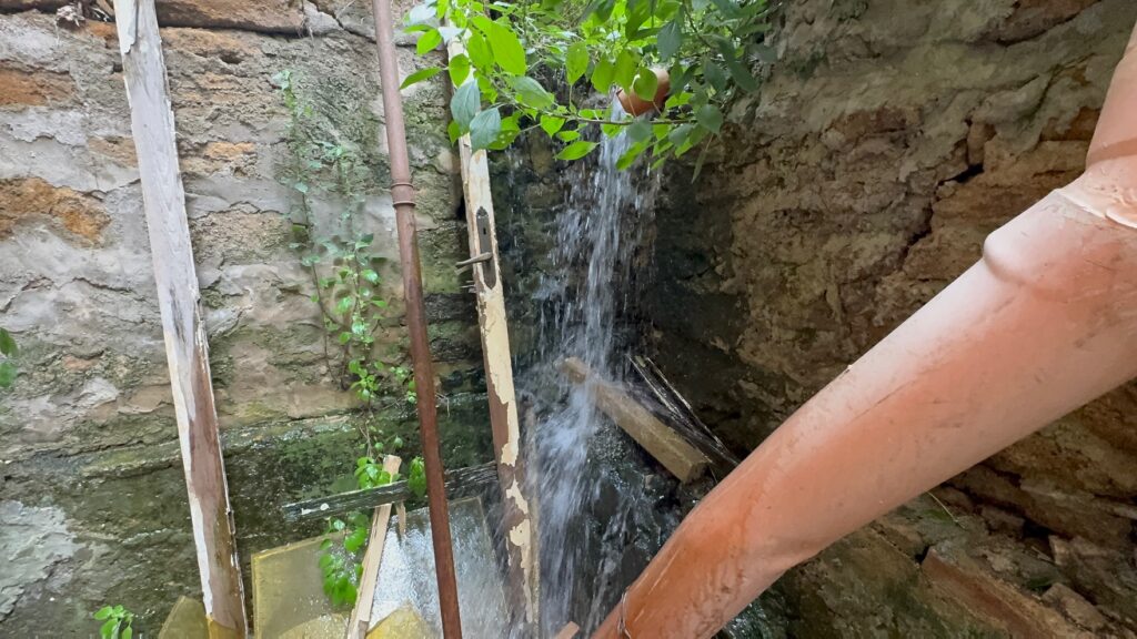 In particolare, le immagini documentano una cascata costante di acqua proveniente da un tubo, che si riversa in una cavità mal protetta, dove resti di infissi, vegetazione e rifiuti si accumulano tra i mattoni fradici. Nella parte superiore della zona si notano serbatoi di plastica abbandonati, mentre sul muro di contenimento si aprono preoccupanti crepe e squarci, visibili a occhio nudo.