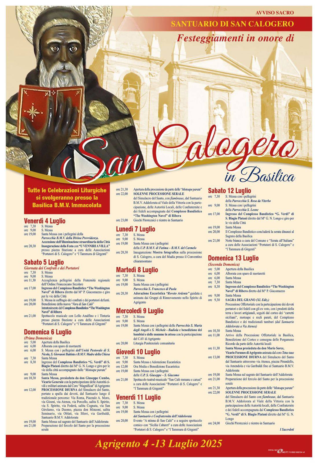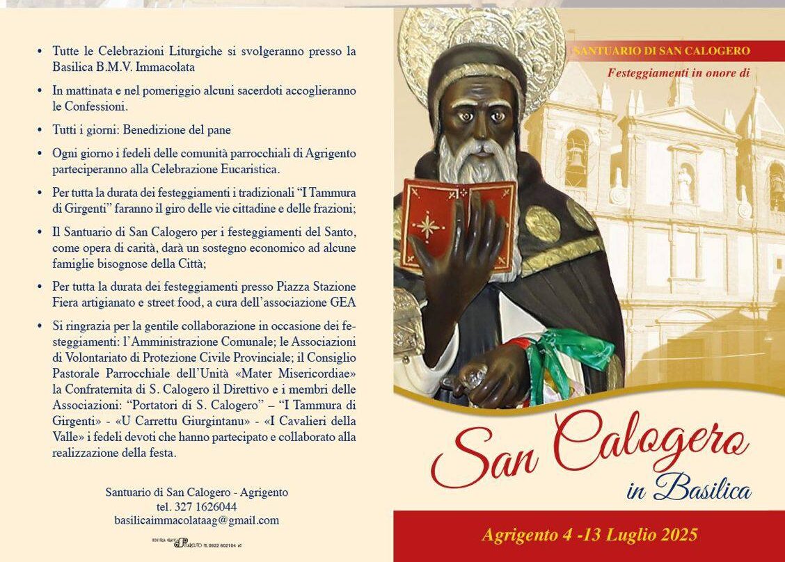 La città si appresta a vivere uno degli appuntamenti più sentiti e partecipati dell’anno: i festeggiamenti in onore di San Calogero, il santo nero tanto amato dagli agrigentini. Il programma ufficiale, diffuso dal Santuario di San Calogero e dalla Basilica B.M.V. Immacolata, copre un periodo che va dal 4 al 13 luglio 2025, con un ricco calendario di appuntamenti religiosi, culturali e di intrattenimento.