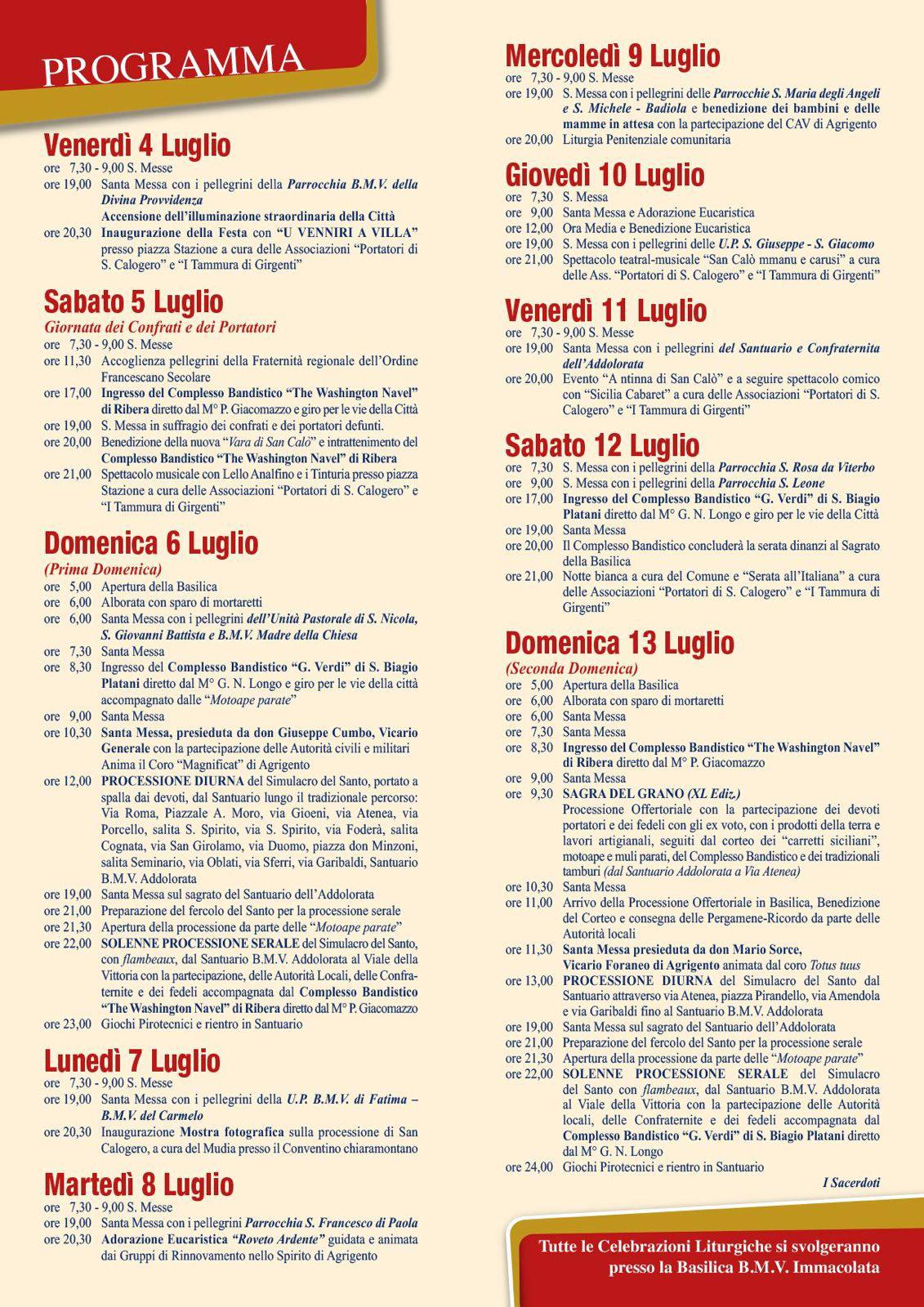 📌 Immancabili i momenti folkloristici con “I Tammura di Girgenti”, le bande musicali, gli spettacoli teatrali e musicali in piazza Stazione, tra cui lo spettacolo comico “A rintina di San Calò” (11 luglio) e la “Serata all’Italiana” (12 luglio).