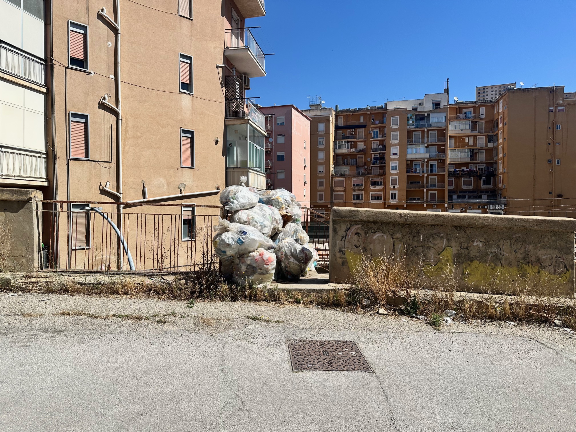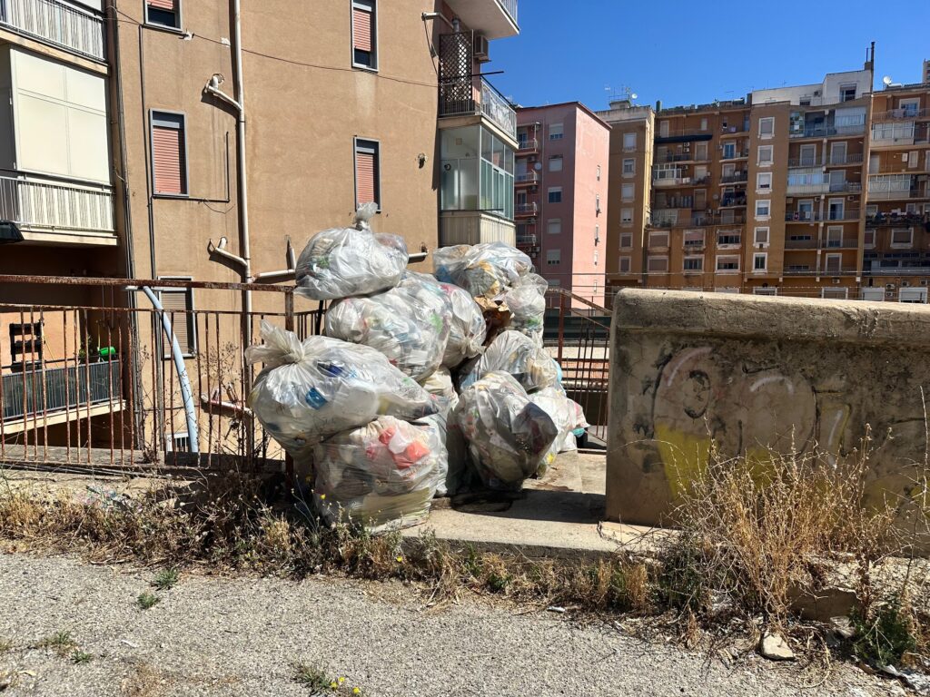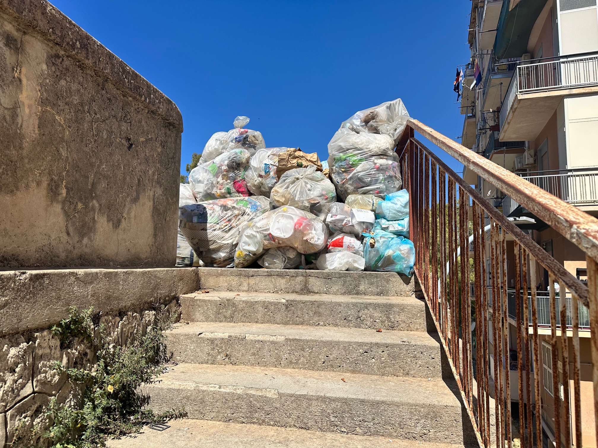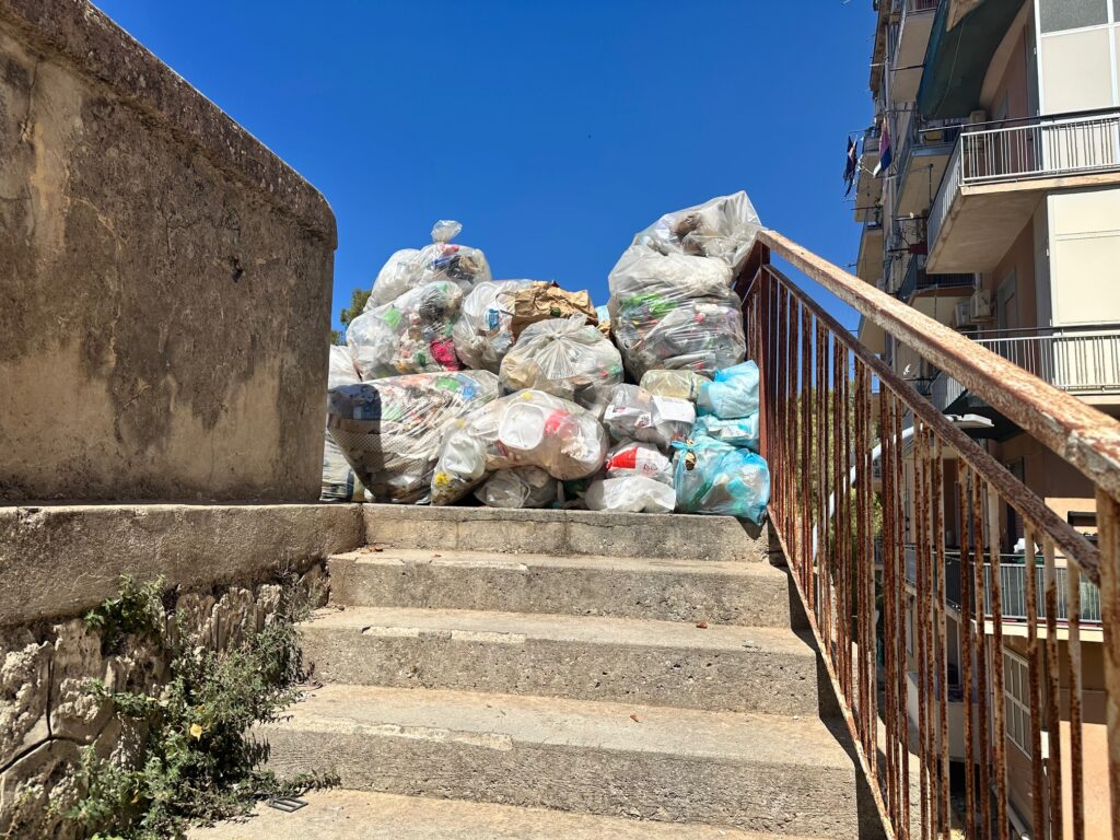 Persino le scale pedonali – che dovrebbero garantire l’accesso alle abitazioni – sono letteralmente bloccate dai rifiuti. Le immagini mostrano un vero e proprio muro di sacchi dell’umido, accatastati da giorni, in un mix di umiliazione urbana e rischio sanitario.