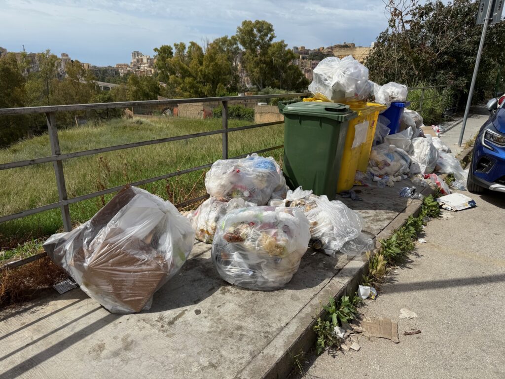 AGRIGENTO – Scene da periferia abbandonata, ma siamo nel cuore di Agrigento, tra Via Tomasi di Lampedusa e Via Mazzini, a due passi dal Tribunale. Cumuli di sacchetti della spazzatura, cartoni, plastica e umido invadono i marciapiedi, ostruiscono scale, occultano ringhiere e cancelli. Un degrado sotto gli occhi di tutti, proprio mentre la città si fregia del titolo di Capitale Italiana della Cultura 2025.