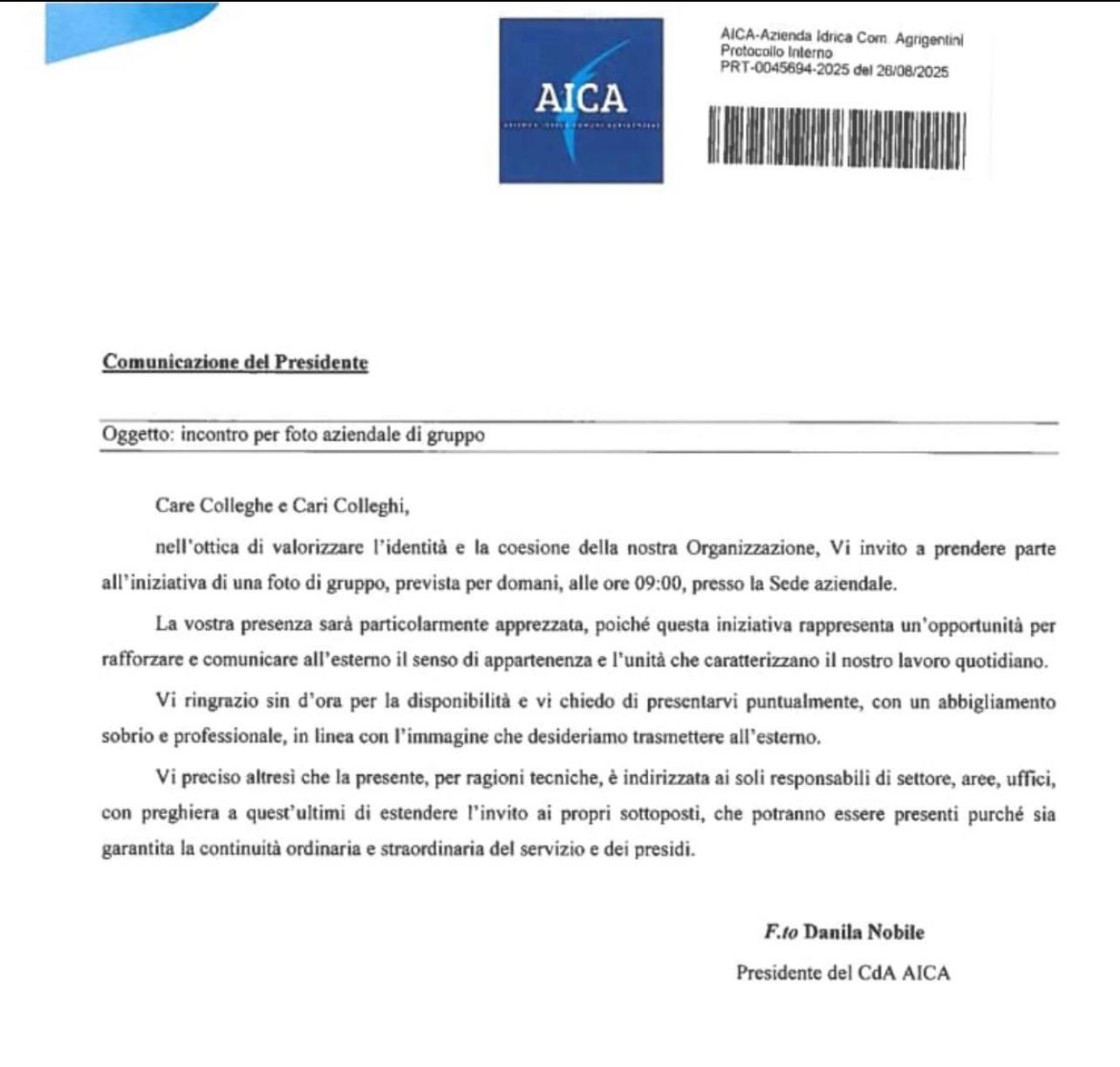 Una comunicazione interna, firmata dalla presidente del CdA Danila Nobile, invita infatti i responsabili e il personale a presentarsi in sede per uno scatto aziendale, previsto alle ore 9:00. Nella nota si parla di “rafforzare e comunicare all’esterno il senso di appartenenza e l’unità che caratterizzano il nostro lavoro quotidiano”.