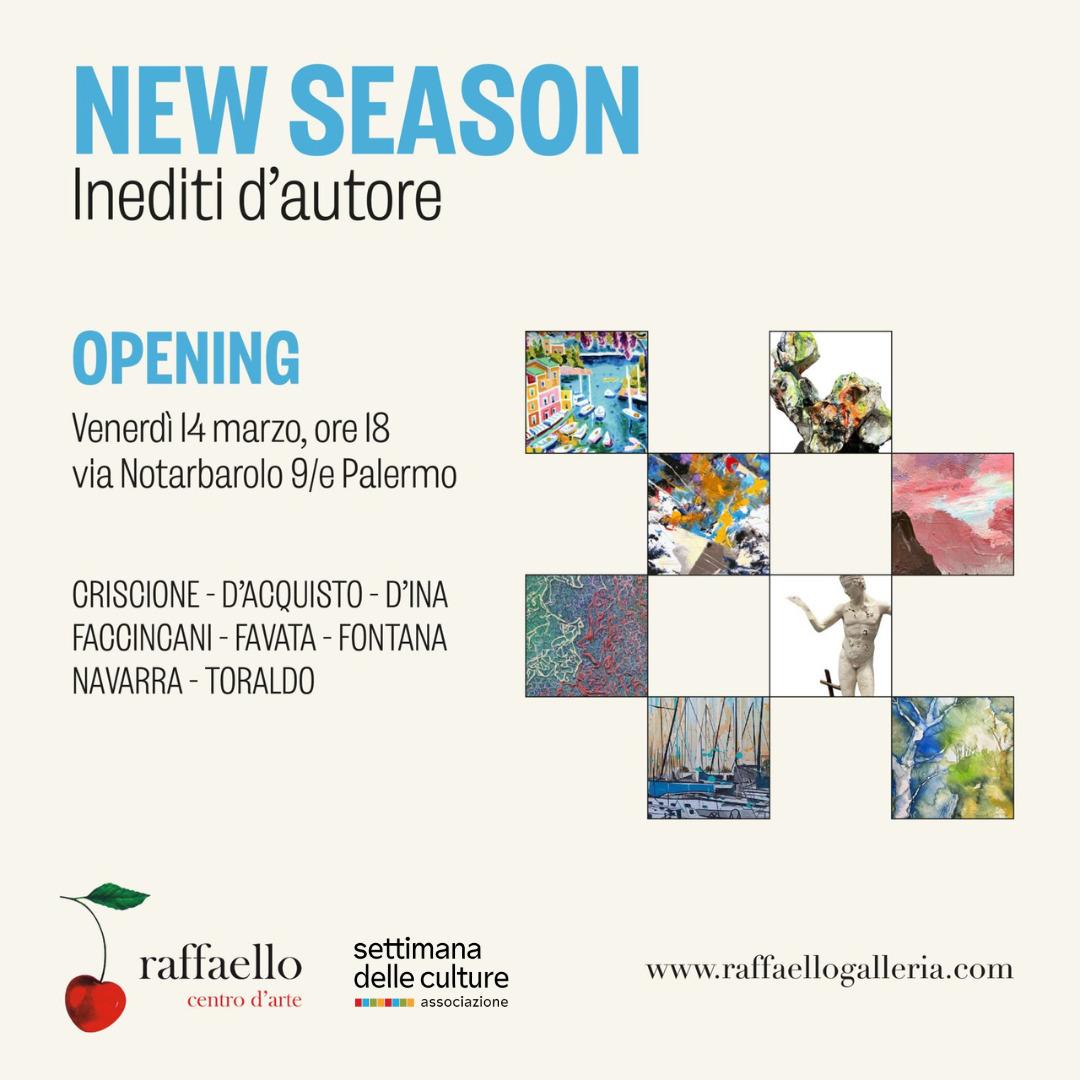 “New Season – Inediti d’autore” è il titolo della collettiva che, dal 14 marzo all’11 aprile, animerà gli spazi espositivi del “Centro d’arte Raffaello”, nella sede di via Emanuele Notarbartolo 9/E.