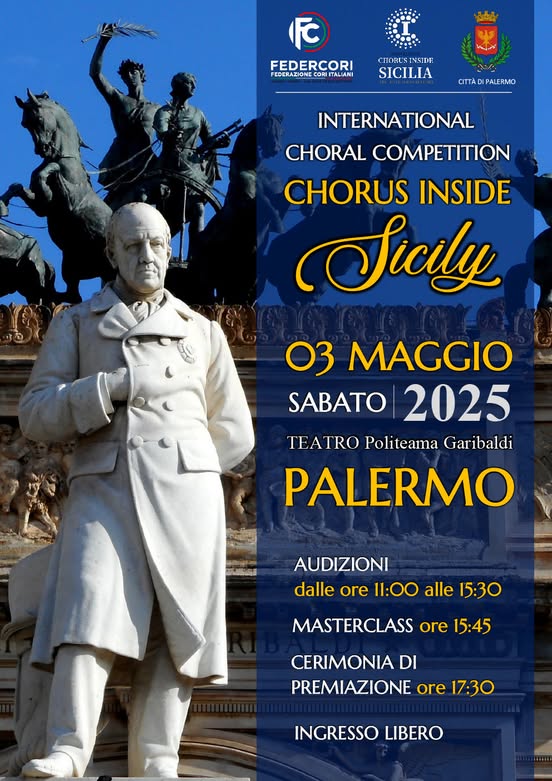 Sabato 3 maggio al Teatro Politeama Garibaldi di Palermo si svolgerà l’International Choral Competition “Chorus Inside Sicily”, un concorso che vede in gara la partecipazione di ben diciassette cori internazionali: il Coro Incontrovoce di Palermo, il Coro e l’Orchestra Settima Polifonia di Palermo, la Cappella Musicale Martiniana di Monreale, il Coro Nade te turbe di Trapani, il Coro degli Erei di Calascibetta, il Coro Augustafolk di Augusta, il Coro , il Coro Budaörsi di Budapest, il Coro Kodály Zoltán di Sovata della Romania, il Coro Kameralny Akolada di Bydgoszcz in Polonia il Coro il Coro Polifonico Perfetta Letizia di Gela, il Coro Mater Dei di Ispica, il Coro Mater Domini di Gravina di Catania, il Coro Polifonico Sergio Alletto di Agrigento e il Coro La Settima Nota di Patti.